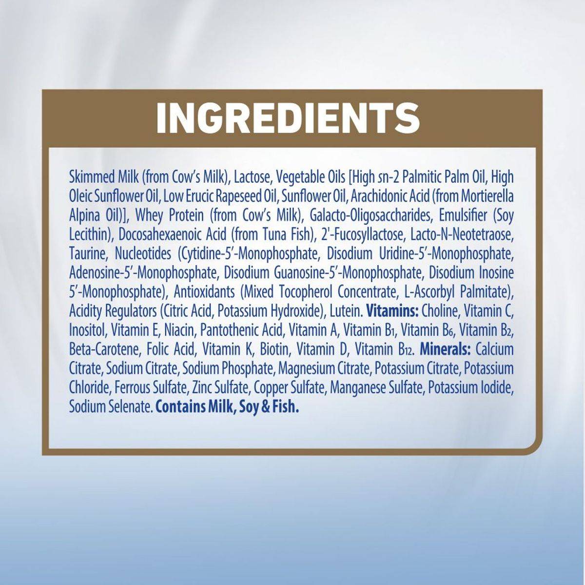 Skimmed Milk (from Cow's Milk), Lactose, Vegetable Oils [High sn-2 Palmitic Palm Oil, High Oleic Sunflower Oil, Low Erucic Rapeseed Oil, Sunflower Oil, Arachidonic Acid (from Mortierella Alpina Oil)], Whey Protein (from Cow's Milk), Galacto-Oligosaccharides, Emulsifier (Soy Lecithin), Docosahexaenoic Acid (from Tuna Fish), 2'-Fucosyllactose, Lacto-N-Neotetraose, Taurine, Nucleotides (Cytidine-5'-Monophosphate, Disodium Uridine-5'-Monophosphate, Adenosine-5'-Monophosphate, Disodium Guanosine-5'-Monophosphate, Disodium Inosine 5'-Monophosphate), Antioxidants (Mixed Tocopherol Concentrate, L-Ascorbyl Palmitate), Acidity Regulators (Citric Acid, Potassium Hydroxide), Lutein, Vitamins: Choline, Vitamin C, Inositol, Vitamin E, Niacin, Pantothenic Acid, Vitamin A, Vitamin B1, Vitamin B6, Vitamin B2, Beta-Carotene, Folic Acid, Vitamin K, Biotin, Vitamin D, Vitamin B12. Minerals: Calcium Citrate, Sodium Citrate, Sodium Phosphate, Magnesium Citrate, Potassium Citrate, Potassium Chloride, Ferrous Sulfate, Zinc Sulfate, Copper Sulfate, Manganese Sulfate, Potassium Iodide, Sodium Selenate. Contains Milk, Soy & Fish.