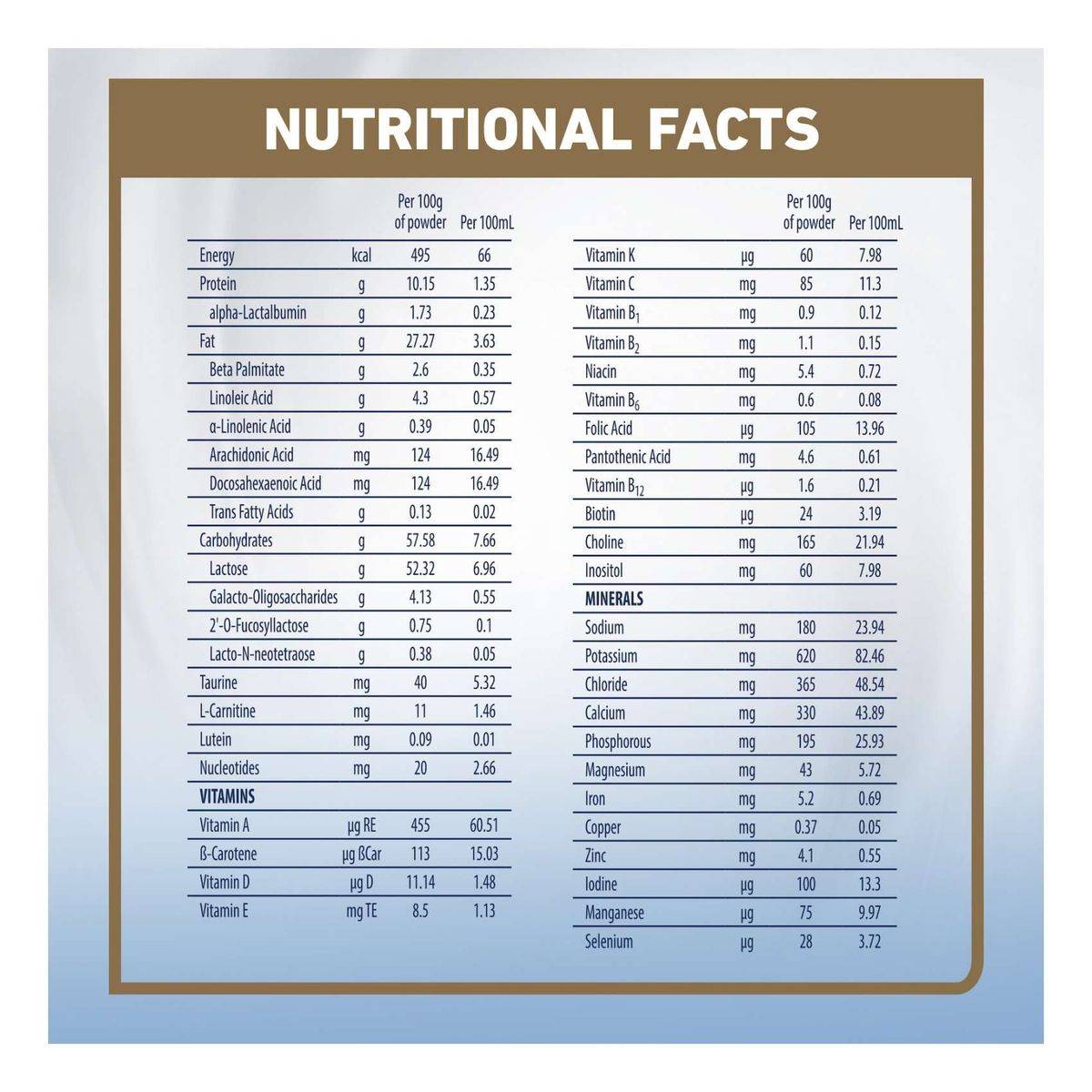 Skimmed Milk (from Cow's Milk), Lactose, Vegetable Oils [High sn-2 Palmitic Palm Oil, High Oleic Sunflower Oil, Low Erucic Rapeseed Oil, Sunflower Oil, Arachidonic Acid (from Mortierella Alpina Oil)], Galacto-Oligosaccharides, Whey Protein (from Cow's Milk), 2'-Fucosyllactose, Docosahexaenoic Acid (from Tuna Fish), Emulsifier (Soy Lecithin), Lacto-N-Neotetraose, L-Tyrosine, Taurine, Nucleotides (Cytidine-5'-Monophosphate, Disodium Uridine-5'-Monophosphate, Adenosine-5'-Monophosphate, Disodium Guanosine-5'-Monophosphate, Disodium Inosine 5'-Monophosphate), Antioxidants (Mixed Tocopherol Concentrate, L-Ascorbyl Palmitate), L-Tryptophan, L-Carnitine, Acidity Regulators (Citric Acid, Potassium Hydroxide), Lutein. Vitamins: Choline, Vitamin C, Inositol, Vitamin E, Niacin, Pantothenic Acid, Vitamin B1, Vitamin B2, Vitamin B6, Vitamin A, Beta-Carotene, Folic Acid, Vitamin K, Biotin, Vitamin D, Vitamin B12. Minerals: Calcium Citrate, Sodium Citrate, Potassium Chloride, Magnesium Chloride, Potassium Citrate, Ferrous Sulfate, Zinc Sulfate, Copper Sulfate, Potassium Iodide, Manganese Sulfate, Sodium Selenate. Contains Milk, Soy & Fish.