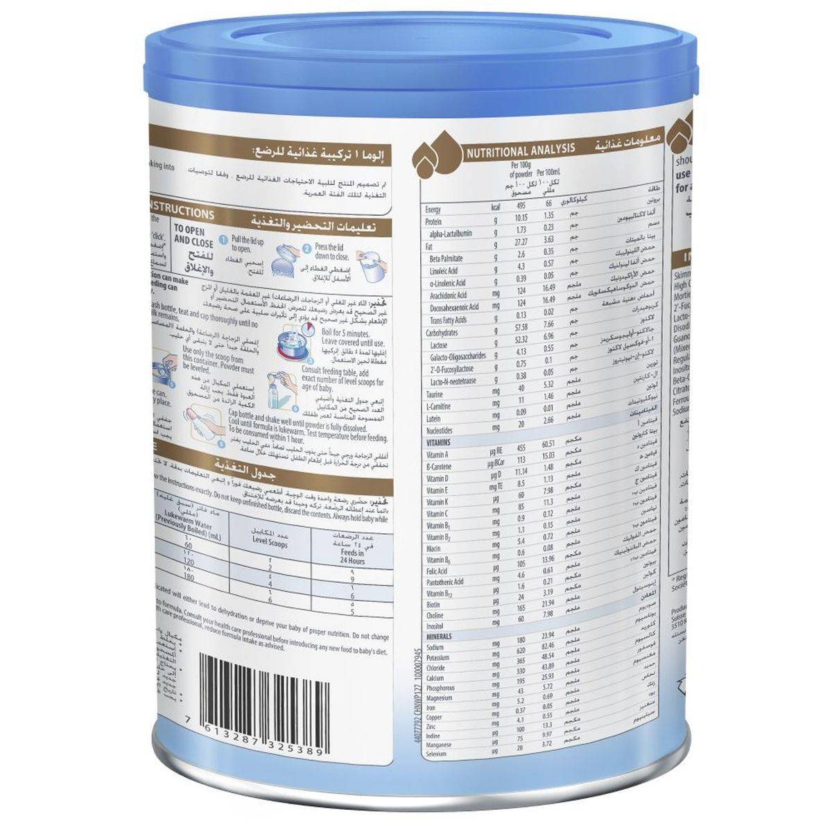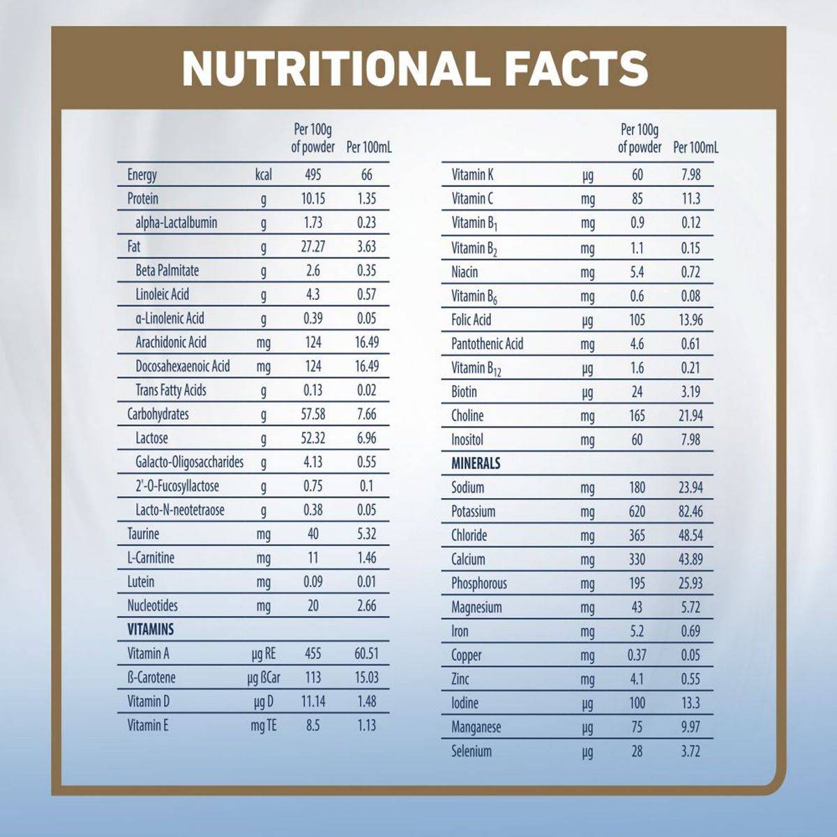 Skimmed Milk (from Cow's Milk), Lactose, Vegetable Oils [High sn-2 Palmitic Palm Oil, High Oleic Sunflower Oil, Low Erucic Rapeseed Oil, Sunflower Oil, Arachidonic Acid (from Mortierella Alpina Oil)], Galacto-Oligosaccharides, Whey Protein (from Cow's Milk), 2-Fucosyllactose, Docosahexaenoic Acid (from Tuna Fish), Emulsifier (Soy Lecithin), Lacto-N-Neotetraose, L-Tyrosine, Taurine, Nucleotides (Cytidine-5'-Monophosphate, Disodium Uridine-5'-Monophosphate, Adenosine-5'-Monophosphate, Disodium Guanosine-5'-Monophosphate, Disodium Inosine-5'-Monophosphate), Antioxidants (Mixed Tocopherol Concentrate, L-Ascorbyl Palmitate), L-Tryptophan, L-Carnitine, Acidity Regulators (Citric Acid, Potassium Hydroxide), Lutein. Vitamins: Choline, Vitamin C, Inositol, Vitamin E, Niacin, Pantothenic Acid, Vitamin B6, Vitamin B2, Vitamin B1, Vitamin A, Beta-Carotene, Folic Acid, Vitamin K, Biotin, Vitamin D, Vitamin B12. Minerals: Calcium Citrate, Sodium Citrate, Potassium Chloride, Magnesium Chloride, Potassium Citrate, Ferrous Sulfate, Zinc Sulfate, Copper Sulfate, Potassium Iodide, Manganese Sulfate, Sodium Selenate. Contains Milk, Soy & Fish.