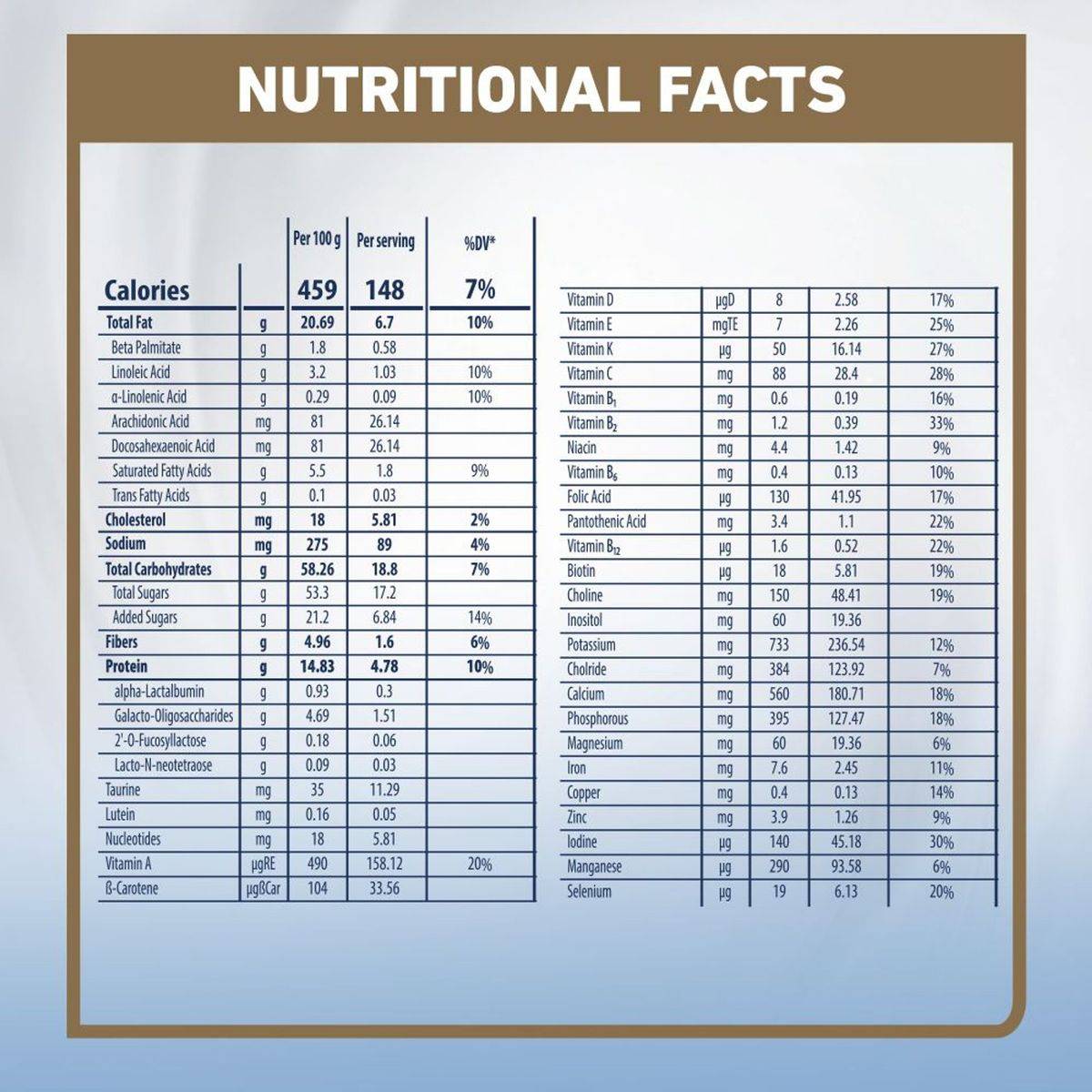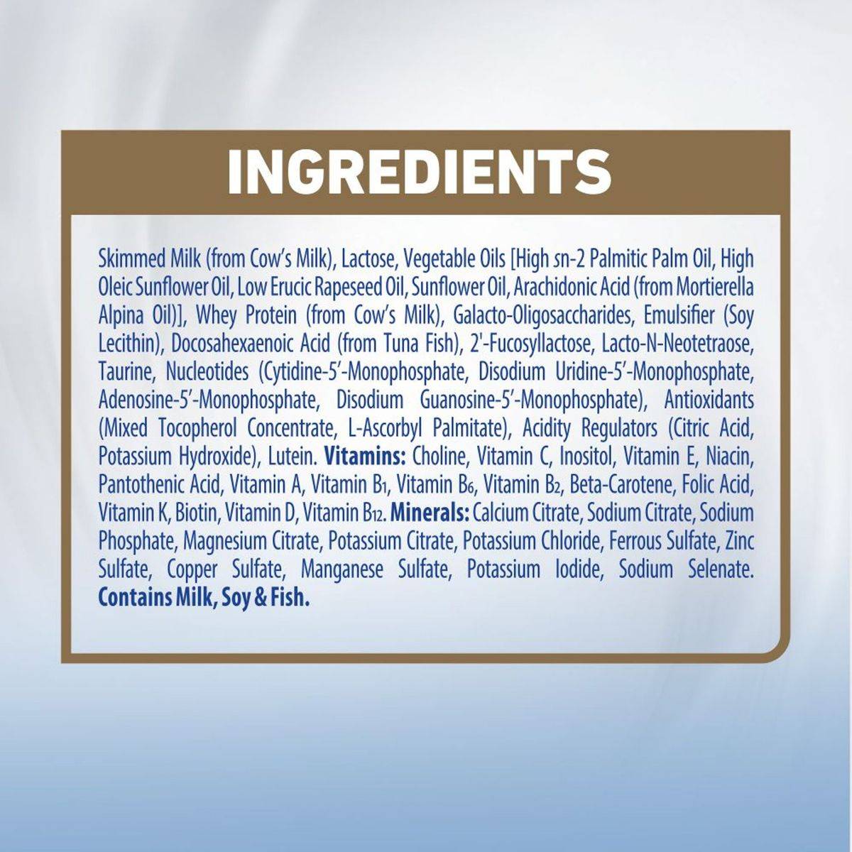 Skimmed Milk (from Cow's Milk), Lactose, Vegetable Oils [High sn-2 Palmitic Palm Oil, High Oleic Sunflower Oil, Low Erucic Rapeseed Oil, Sunflower Oil, Arachidonic Acid (from Mortierella Alpina Oil)], Whey Protein (from Cow's Milk), Galacto-Oligosaccharides, Emulsifier (Soy Lecithin), Docosahexaenoic Acid (from Tuna Fish), 2'-Fucosyllactose, Lacto-N-Neotetraose, Taurine, Nucleotides (Cytidine-5'-Monophosphate, Disodium Uridine-5'-Monophosphate, Adenosine-5'-Monophosphate, Disodium Guanosine-5'-Monophosphate), Antioxidants (Mixed Tocopherol Concentrate, L-Ascorbyl Palmitate), Acidity Regulators (Citric Acid, Potassium Hydroxide), Lutein. Vitamins: Choline, Vitamin C, Inositol, Vitamin E, Niacin, Pantothenic Acid, Vitamin A, Vitamin B1, Vitamin B6, Vitamin B2, Beta-Carotene, Folic Acid, Vitamin K, Biotin, Vitamin D, Vitamin B12. Minerals: Calcium Citrate, Sodium Citrate, Sodium Phosphate, Magnesium Citrate, Potassium Citrate, Potassium Chloride, Ferrous Sulfate, Zinc Sulfate, Copper Sulfate, Manganese Sulfate, Potassium Iodide, Sodium Selenate. Contains Milk, Soy & Fish.