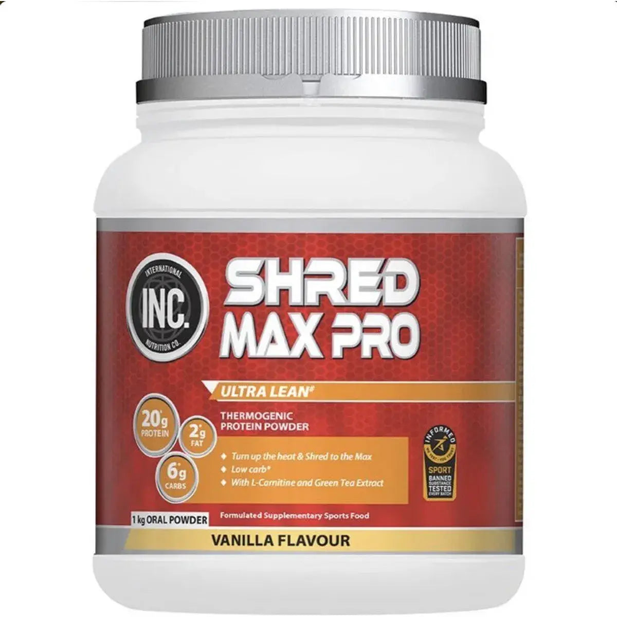 INC Shred Max Pro Vanilla is a thermogenic protein shake designed to support lean muscle growth. It features a low-carb formula with L-Carnitine and Green Tea Extract, ideal for those seeking a toned physique. The blend of Whey Protein Concentrate and Isolate aids in muscle repair and growth. Suitable for use before and after workouts.