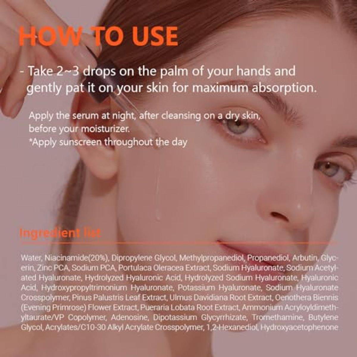 Water, Niacinamide (20%), Dipropylene Glycol, Methylpropanediol, Propanediol, Arbutin, Glycerin, Zinc PCA, Sodium PCA, Portulaca Oleracea Extract, Sodium Hyaluronate, Sodium Acetylated Hyaluronate, Hydrolyzed Hyaluronic Acid, Hydrolyzed Sodium Hyaluronate, Hyaluronic Acid, Hydroxypropyltrimonium Hyaluronate, Potassium Hyaluronate, Sodium Hyaluronate Crosspolymer, Pinus Palustris Leaf Extract, Ulmus Davidiana Root Extract, Oenothera Biennis (Evening Primrose) Flower Extract, Pueraria Lobata Root Extract, Ammonium Acryloyldimethyltaurate/VP Copolymer, Adenosine, Dipotassium Glycyrrhizate, Tromethamine, Butylene Glycol, Acrylates/C10-30 Alkyl Acrylate Crosspolymer, 1,2-Hexanediol, Hydroxyacetophenone.
