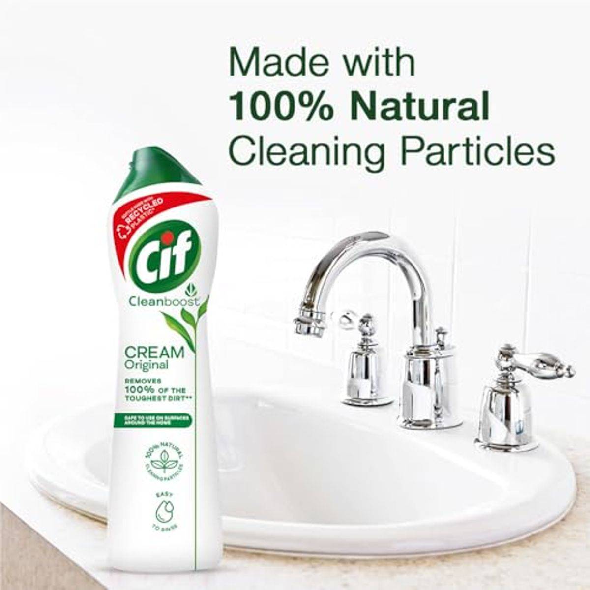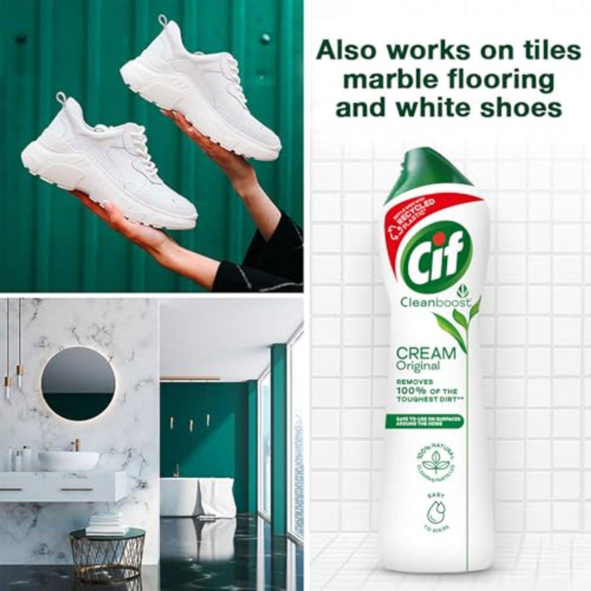 Jif Cream Cleaner Original 500ml is a powerful cleaning solution designed to remove the toughest dirt and grime. Its Cleanboost formula ensures surfaces are left sparkling clean with a 100% shine. Safe for use on various surfaces around the home, including tiles, marble flooring, and white shoes. The bottle is made with recycled plastic, emphasizing sustainability.