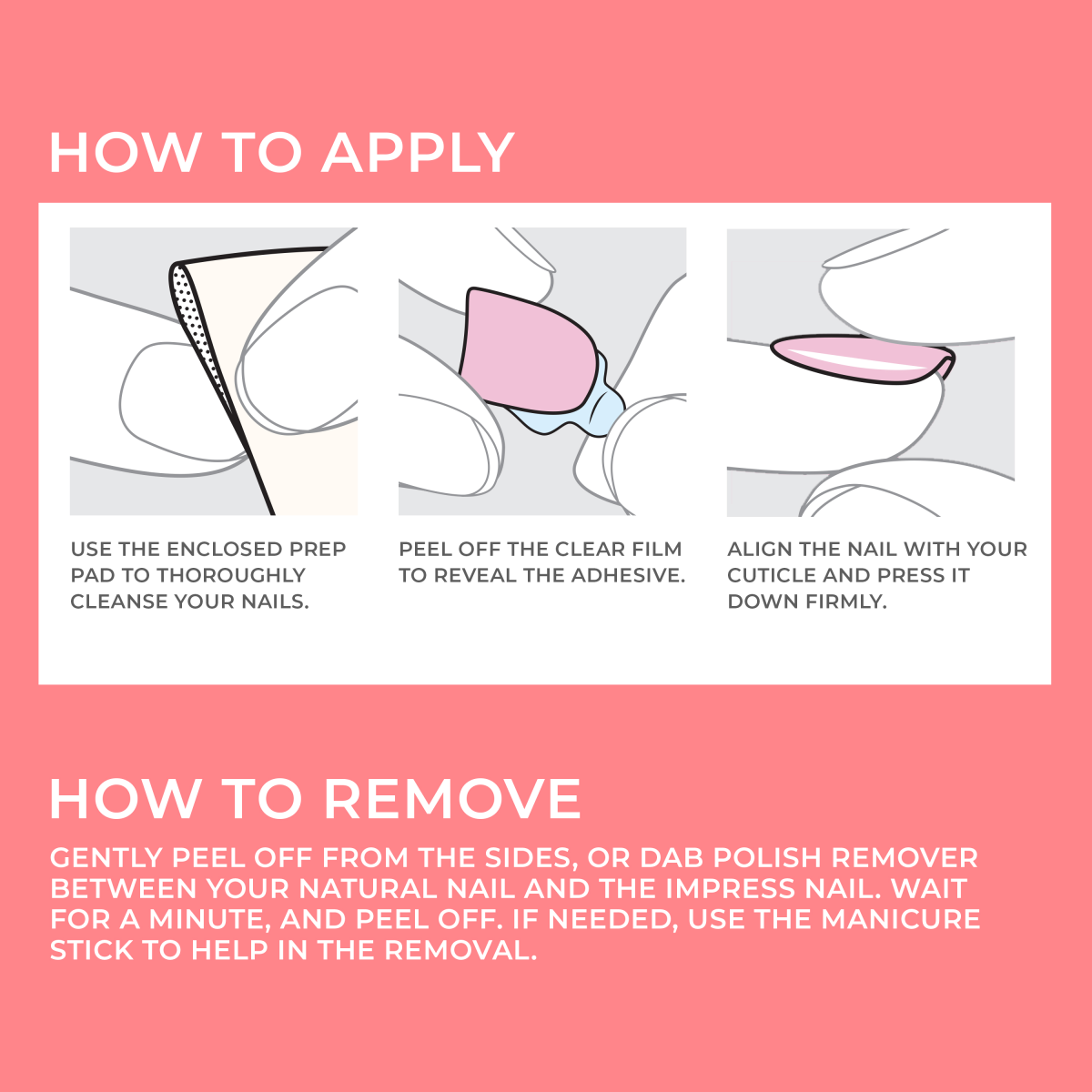 Use the enclosed prep pad to thoroughly cleanse your nails. Peel off the clear film to reveal the adhesive. Align the nail with your cuticle and press it down firmly.