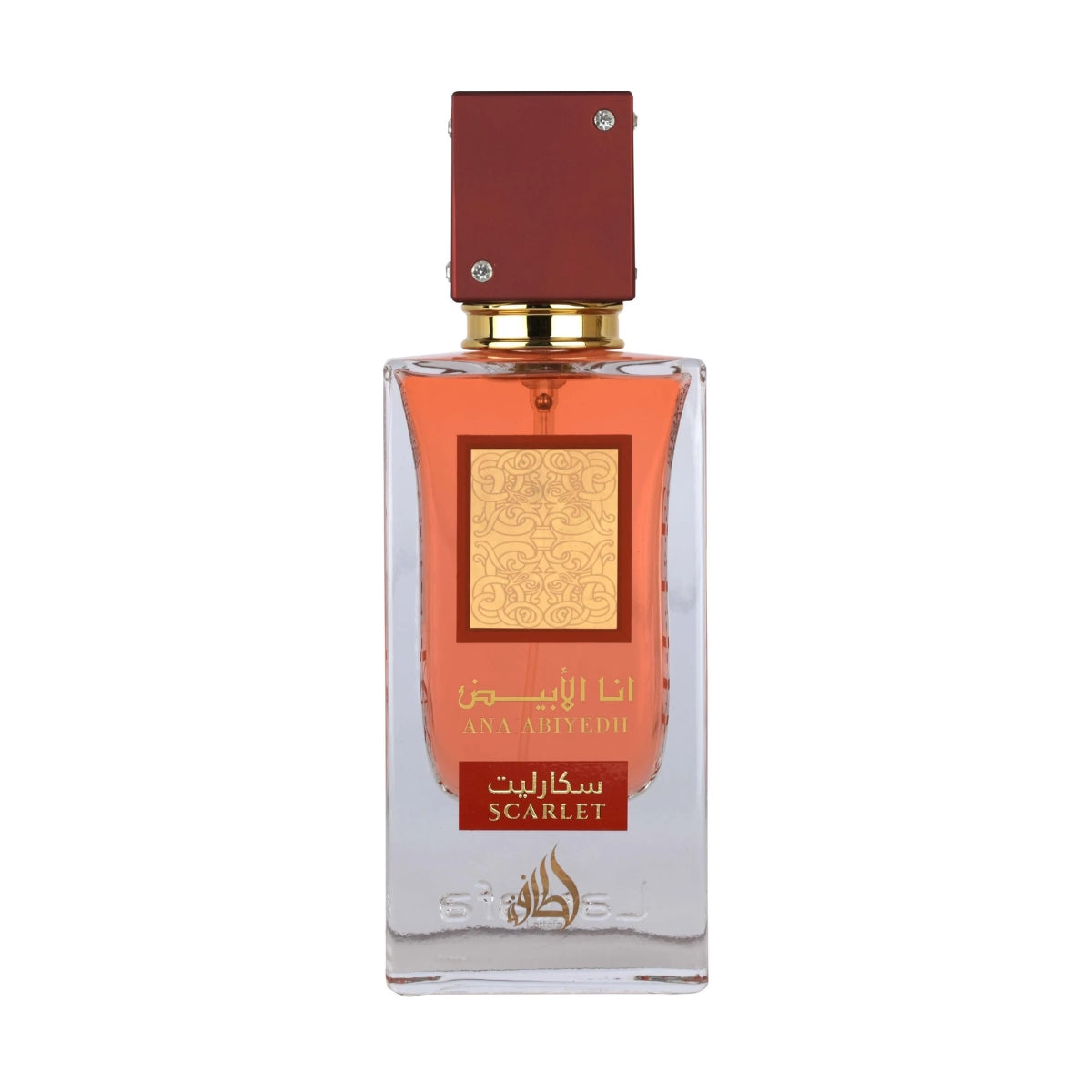 Lattafa is a UAE fragrance house. Ana Abiyedh Scarlet is a unisex scent, likely a flanker emphasizing a red, juicy, or intense fruity-floral note.