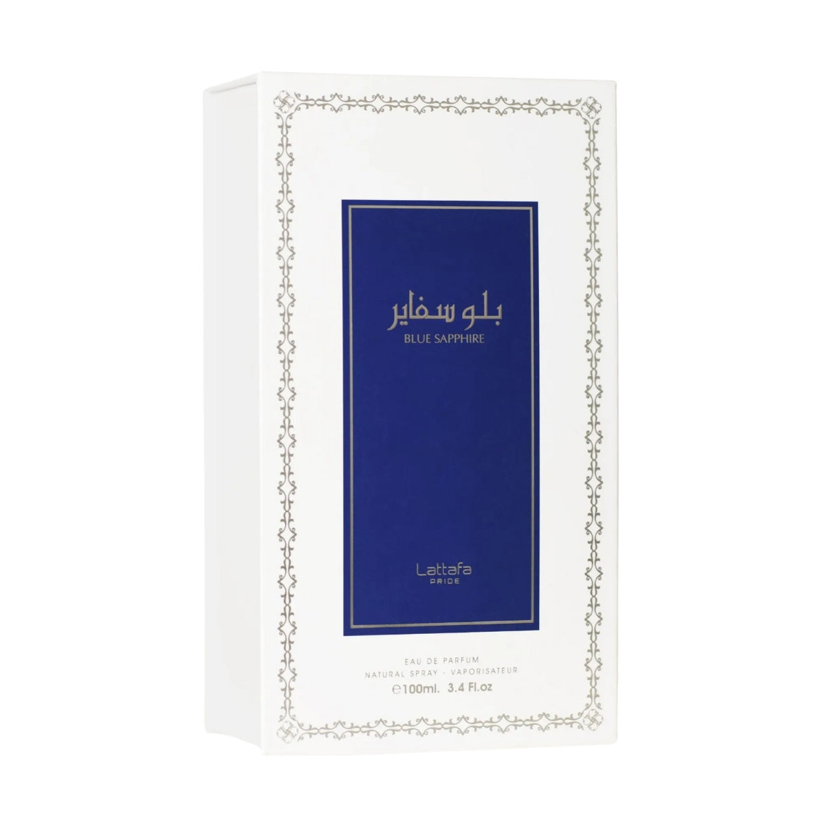 Lattafa Blue Sapphire EDP is a bold and sophisticated fragrance. It features top notes of Apple, Mint, and Lemon, with Geranium, Clarysage, and Marine at its heart, and a base of Patchouli and Cedarwood.