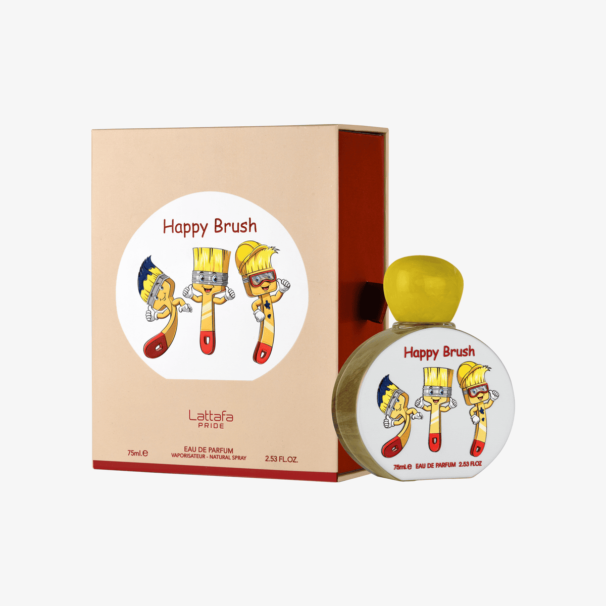 Lattafa Kids Happy Brush EDP offers a fruity-gourmand scent with notes of peach, pineapple, raspberry, vanilla, and caramel. Ideal for playful, joyful moments.