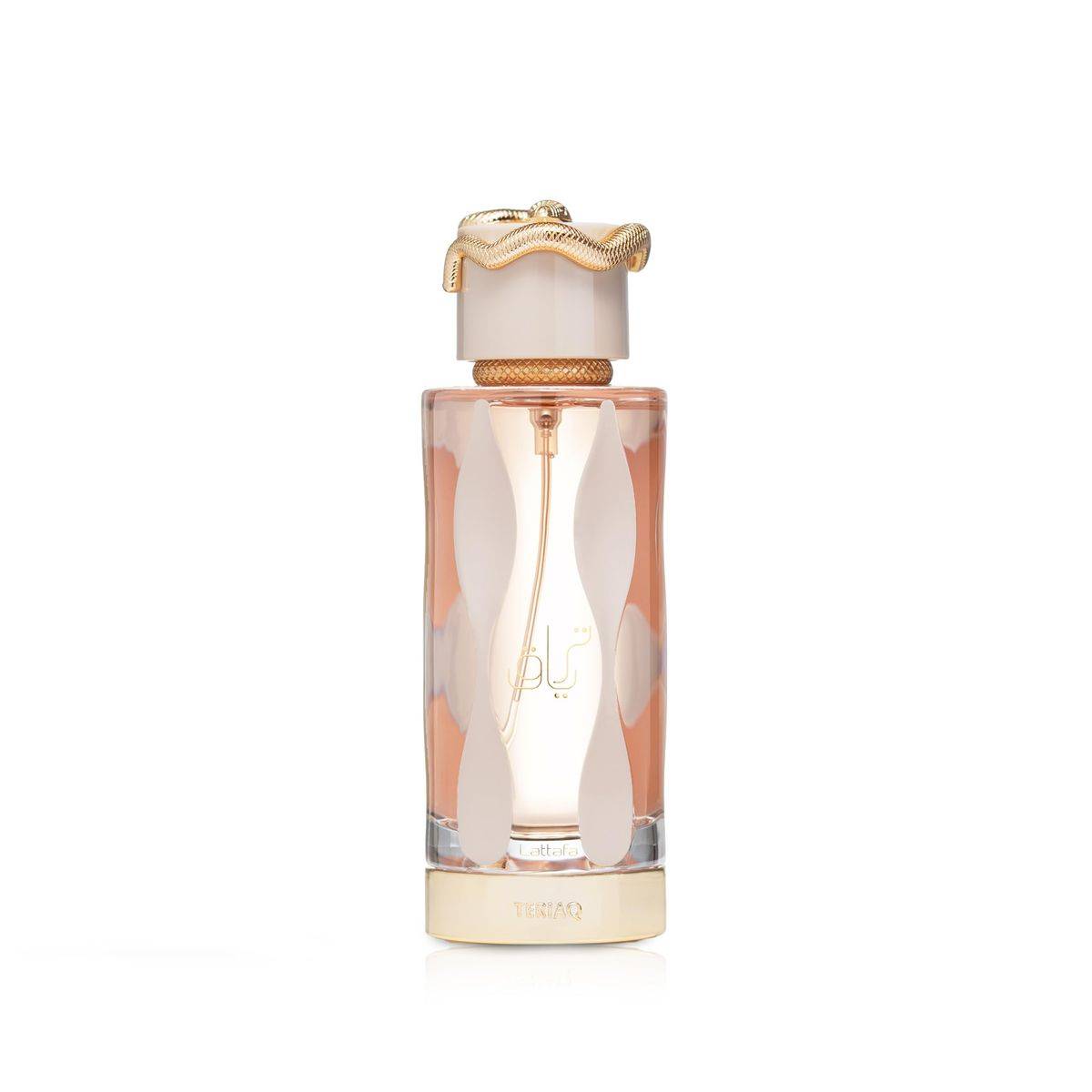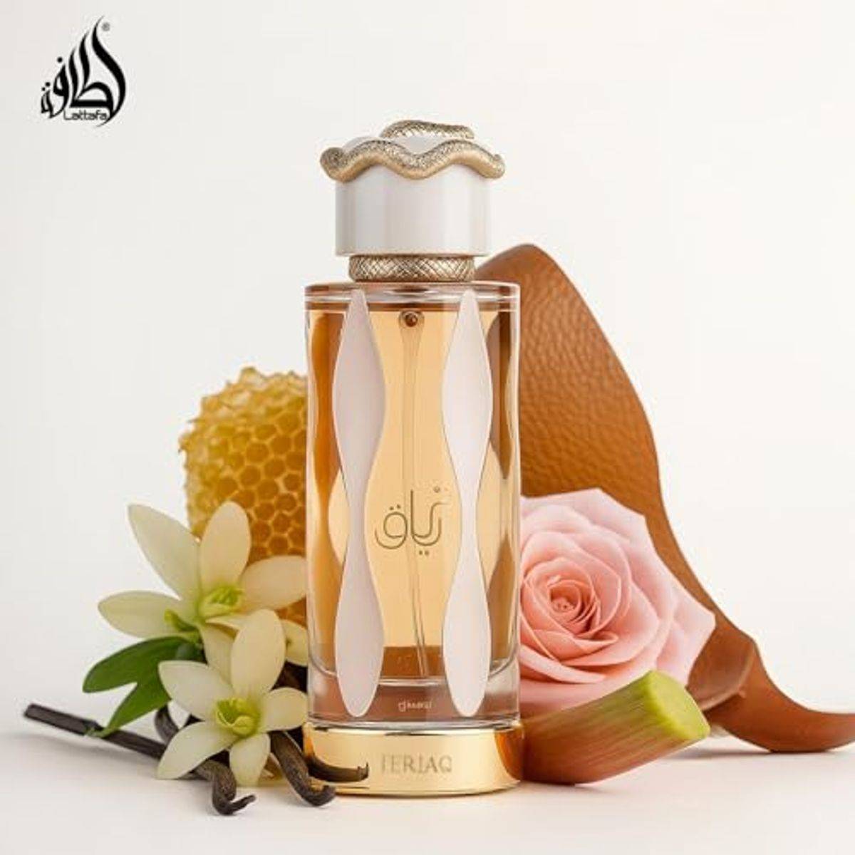 Lattafa Teriaq is a unisex Eau de Parfum launched in 2024. It features a captivating blend of caramel, pink pepper, and apricot top notes, with a heart of honey and rose. The base is enriched with leather and vanilla, offering a luxurious finish. Ideal for any occasion, this fragrance is a testament to Lattafa's expertise in creating versatile scents.