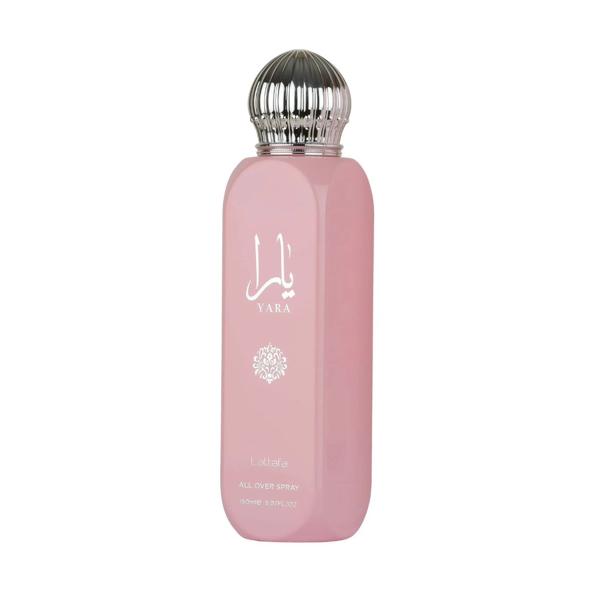Lattafa Yara All Over Spray offers a luxurious floral scent with tangerine, heliotrope, and sandalwood. Perfect for body, hair, and clothes.