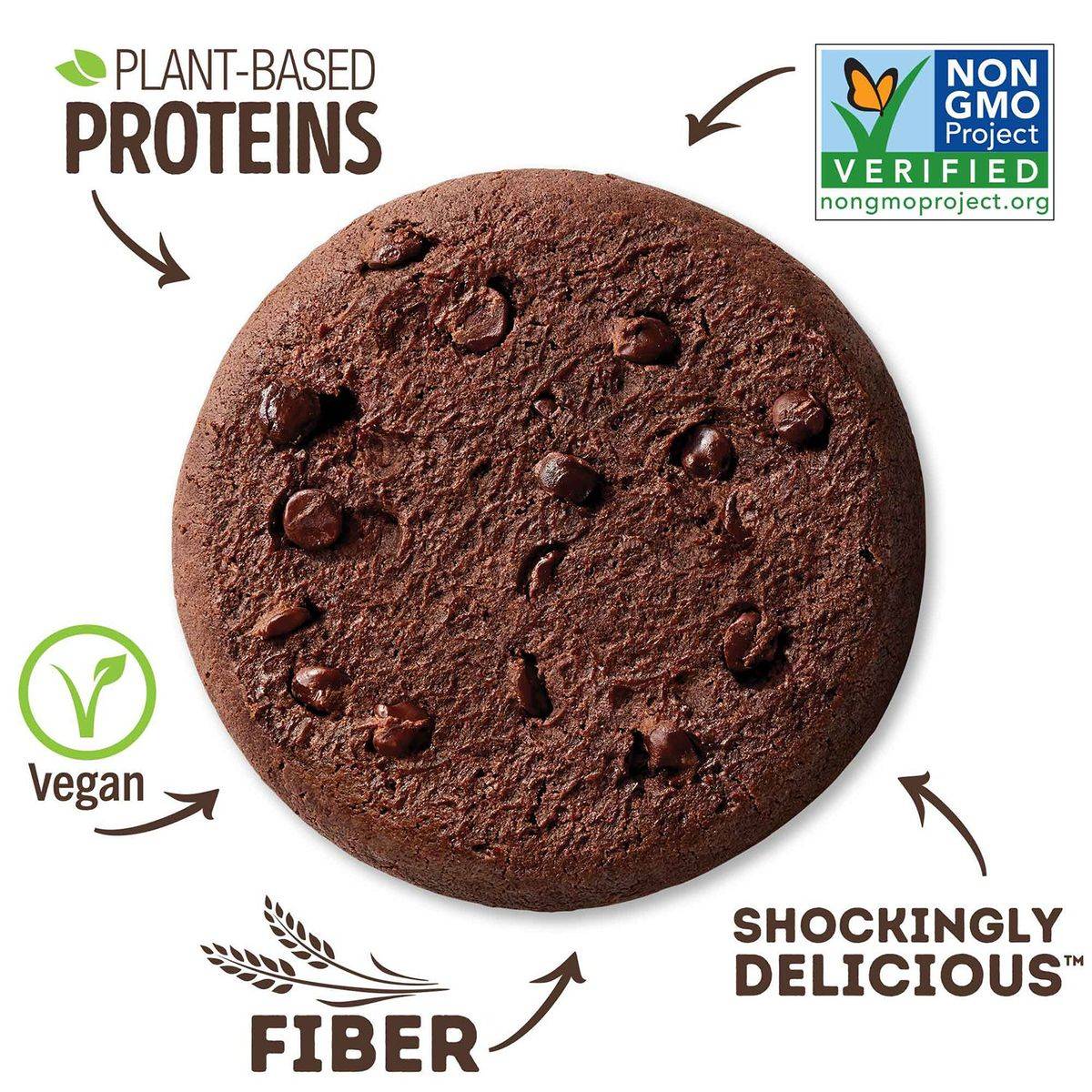 Lenny & Larry's The Complete Cookie Double Chocolate offers 16g of plant-based protein and 10g of fiber per cookie. Vegan, non-GMO, and kosher-friendly, it is a delicious, guilt-free snack option.