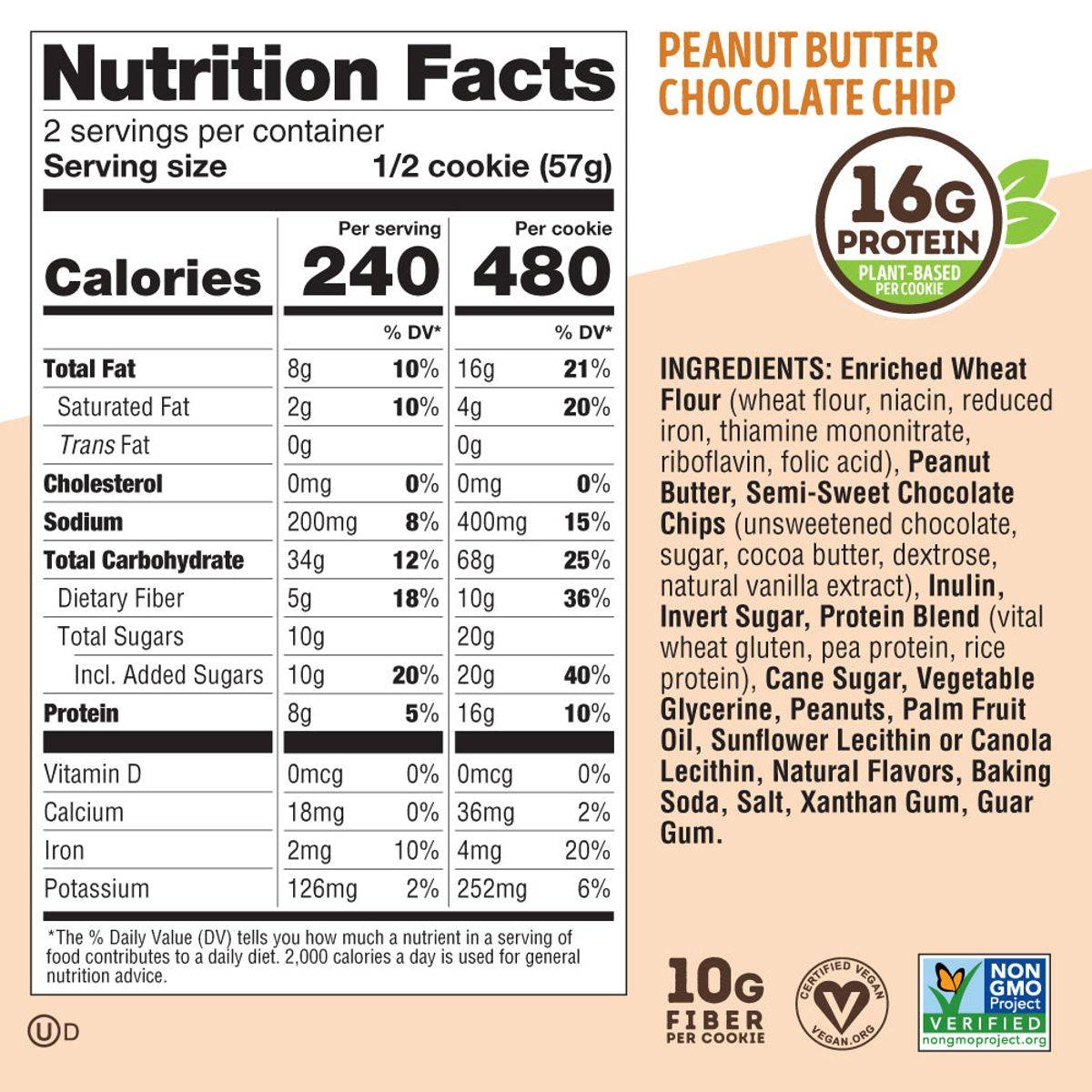 Enriched Wheat Flour (Wheat Flour, Niacin, Reduced Iron, Thiamine Mononitrate, Riboflavin, Folic Acid), Peanut Butter, Semi Sweet Chocolate Chips (Unsweetened Chocolate, Sugar, Cocoa Butter, Dextrose, Natural Vanilla Extract), Inulin, Invert Sugar, Protein Blend (Vital Wheat Gluten, Pea Protein, Rice Protein), Cane Sugar, Vegetable Glycerine, Peanuts, Palm Fruit Oil, Sunflower Lecithin Or Canola Lecithin, Natural Flavors, Baking Soda, Salt, Xanthan Gum, Guar Gum.