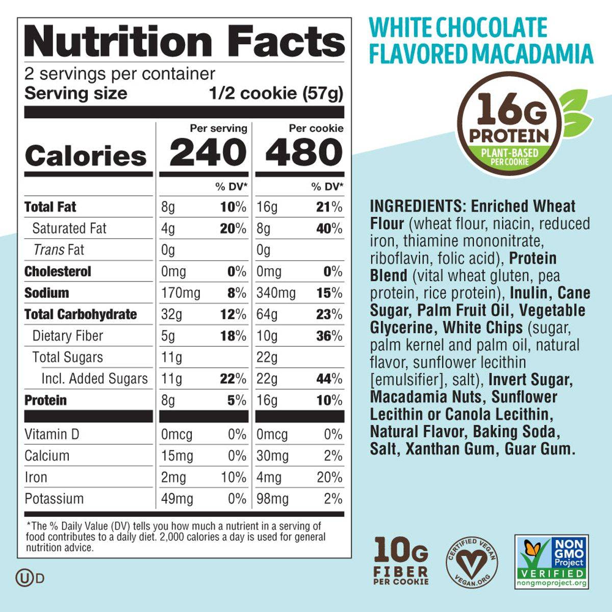 Enriched Wheat Flour (Wheat Flour, Niacin, Reduced Iron, Thiamine Mononitrate, Riboflavin, Folic Acid), Protein Blend (Vital Wheat Gluten, Pea Protein, Rice Protein), Inulin, Cane Sugar, Palm Fruit Oil, Vegetable Glycerine, White Chips (Sugar, Palm Kernel And Palm Oil, Natural Flavor, Sunflower Lecithin [Emulsifier], Salt), Invert Sugar, Macadamia Nuts, Sunflower Lecithin Or Canola Lecithin, Natural Flavor, Baking Soda, Salt, Xanthan Gum, Guar Gum.