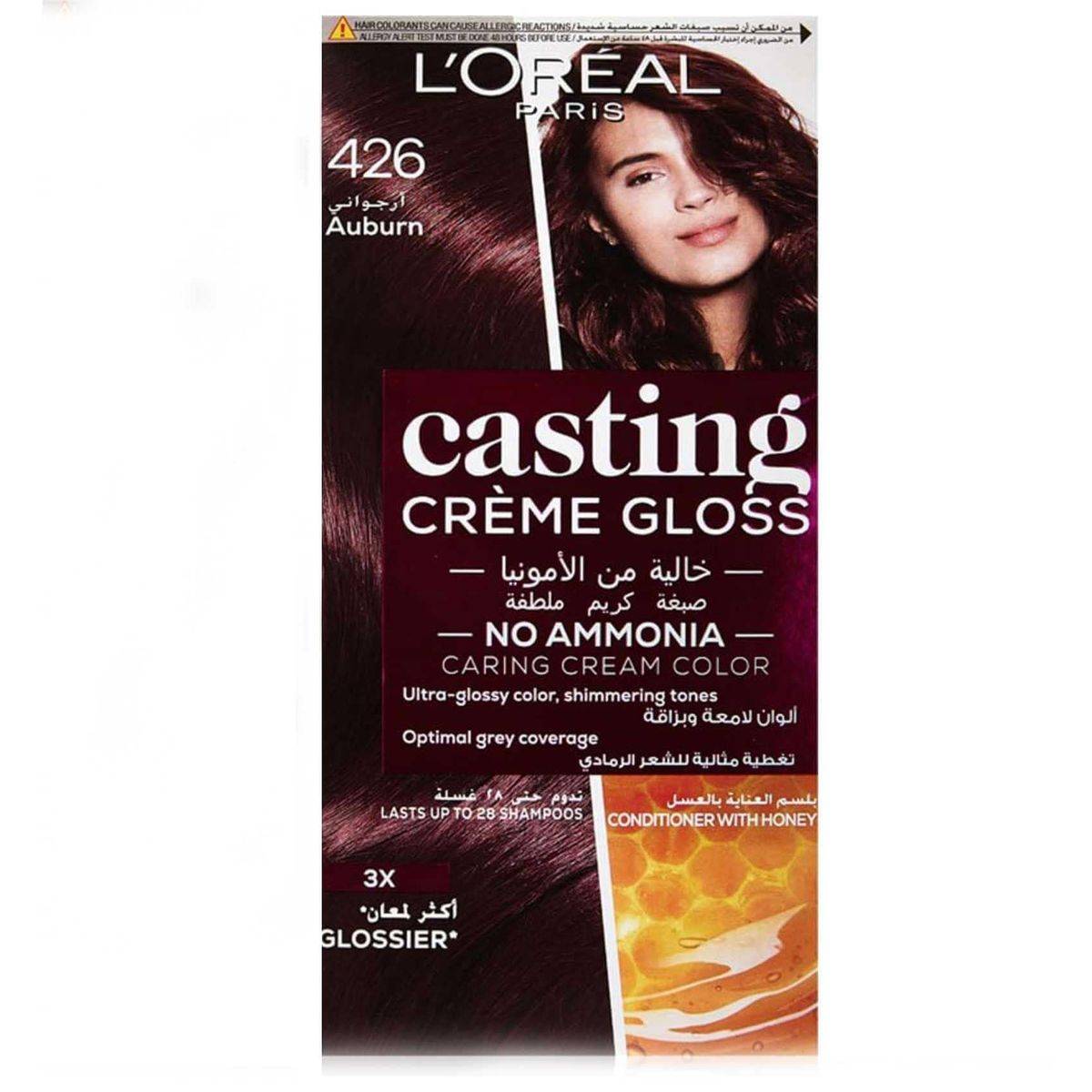 L'Oréal Paris Casting Crème Gloss 426 Auburn is a semi-permanent hair color that blends away gray hair for a natural-looking color. It leaves hair full of visible shimmering tones and includes a nourishing conditioner with coconut oil. The no ammonia formula provides a pleasant smell, and the color lasts up to 28 shampoos.