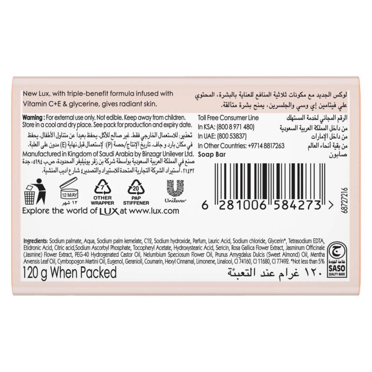 This Lux Radiant Skin Bar Soap is enriched with Vitamin C, E, and Glycerine. It brightens, nourishes, and hydrates the skin, leaving it radiant and smooth. The soap features a rich, creamy lather and a delicate jasmine fragrance, perfect for daily use.