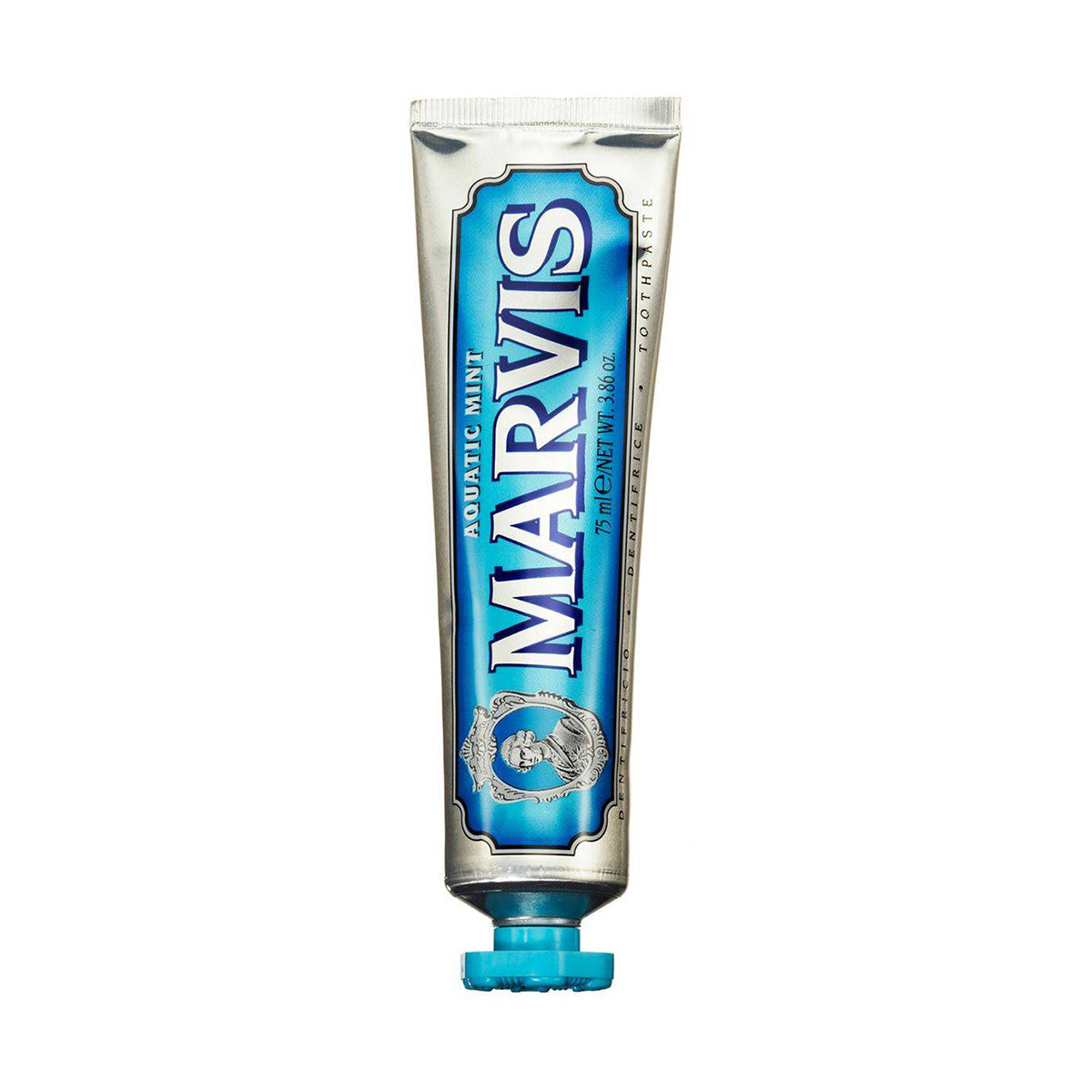 Marvis Aquatic Mint Toothpaste offers a refreshing blend of mint and aquatic freshness. Formulated with fluoride, it protects against tooth decay, tartar, and plaque. The rich, creamy texture ensures thorough cleaning and a delightful taste sensation, leaving your breath fresh all day. Packaged in a distinctive tube, it adds elegance to your oral care routine.