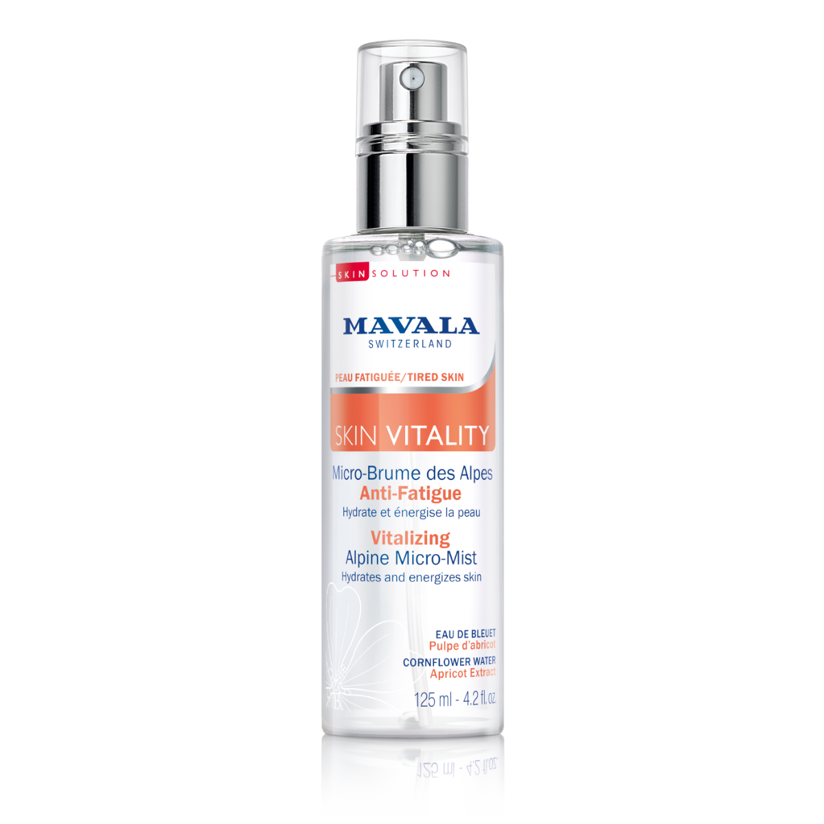 Mavala Swiss Skin Solution Skin Vitality Alpine Micro Mist revitalizes tired skin with cornflower water and apricot extract. Ideal for daily use to hydrate and energize.