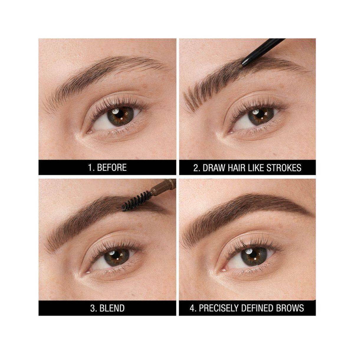 Brush your eyebrows first, then fill in gaps by drawing small hairs in the direction of growth, and blend with the brush side.