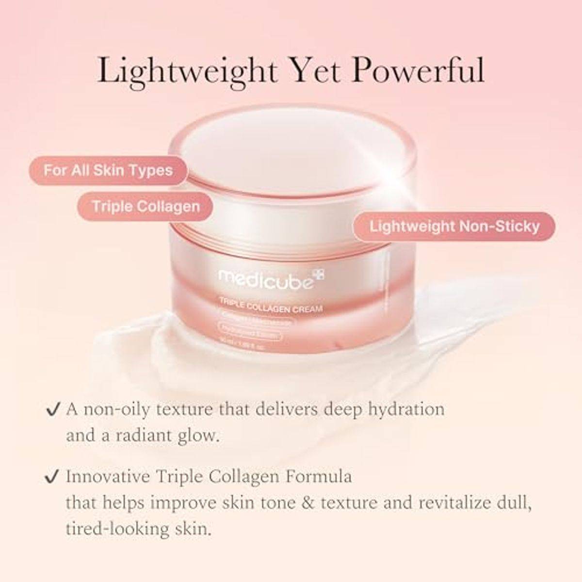 Medicube Triple Collagen Cream 4.0 is a luxurious moisturizer designed to boost skin elasticity and hydration while reducing visible signs of aging. Formulated with a Triple Collagen Complex, it supports skin firmness and delivers a plump, youthful appearance. Suitable for all skin types, it provides deep hydration and improves skin texture.