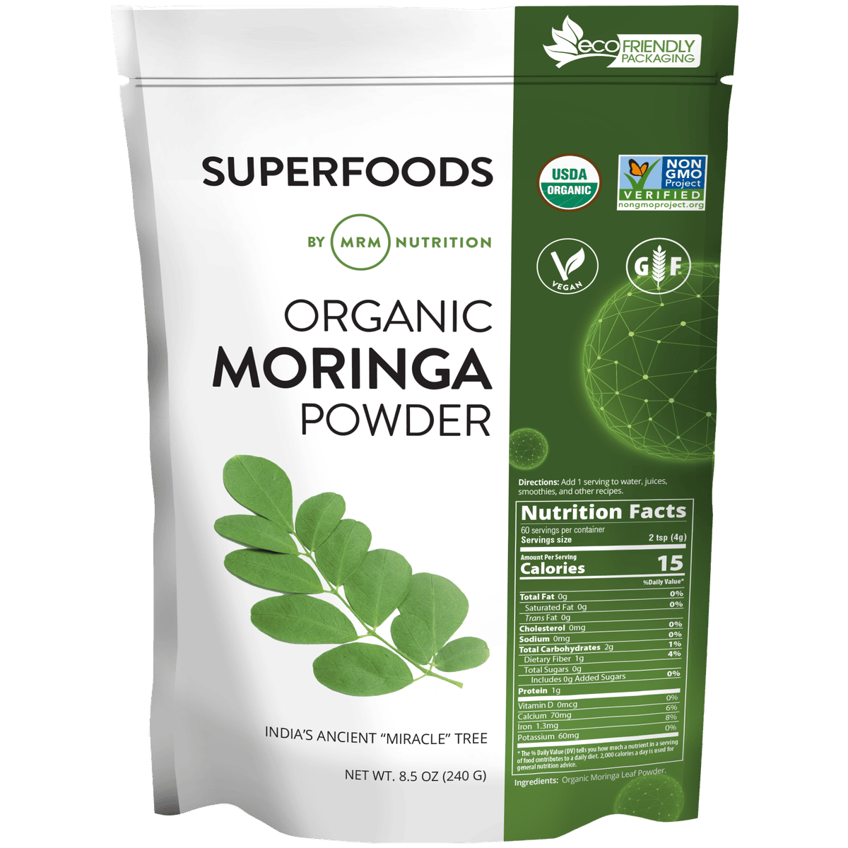 MRM Nutrition Moringa Powder is a nutrient-dense, high-protein, and high-fiber whole leaf powder. It contains essential amino acids, calcium, and potassium, supporting bone density and electrolyte balance. USDA Organic, Non-GMO, and Vegan certified, it is ideal for smoothies, yogurts, and cereals.