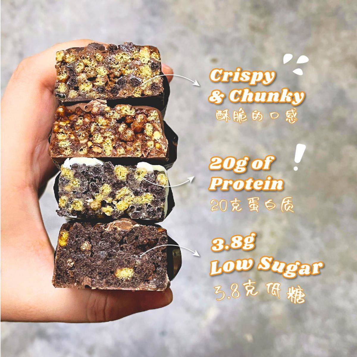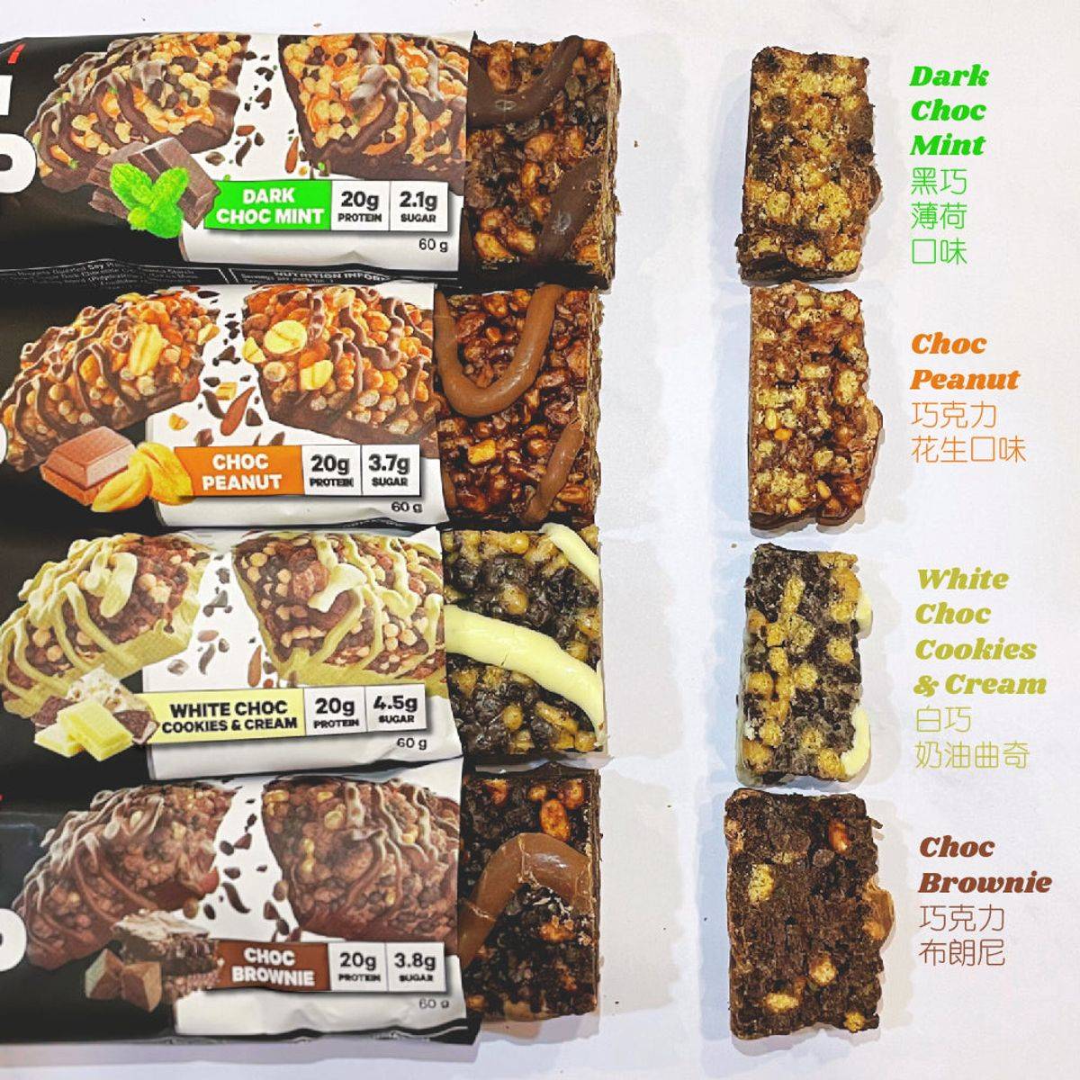 Soy Protein Nuggets (Isolated Soy Protein, Tapioca Starch, Salt), No Added Sugar Dark Chocolate (24%) (Cocoa Mass, Cocoa Butter, Bulking Agent (Polydextrose), Sweeteners (Erythritol, Steviol Glycosides), Emulsifier (Soy Lecithin), Flavour), Glucose Syrup (Sulphites), Cocoa Soy Protein Nuggets (Isolated Soy Protein, Tapioca Starch, Cocoa Powder, Salt), No Added Sugar Caramel [Sweetener (Sorbitol), Bulking Agent (Polydextrose), Vegetable Oils, Stabilisers (Cellulose Microcrystalline, Locust Bean Gum, Xanthan Gum), Emulsifier (Soy Lecithin)], Humectant (Glycerol), Mint Chips (4.5%) [Sweetener (Isomalt), Flavour, Colour (141), Processing Aid (Soy)], No Added Sugar Milk Chocolate Drops [Sweeteners (Erythritol, Steviol Glycosides), Emulsifier (Soy Lecithin)], Peanut Butter, Soy Protein Isolate, Pea Protein Isolate, Peanut Flour, Flavour, Salt, Sweetener (Sucralose). Contains milk, soy, peanut, sulphites. May contain wheat, gluten, sesame, hazelnut, almond.