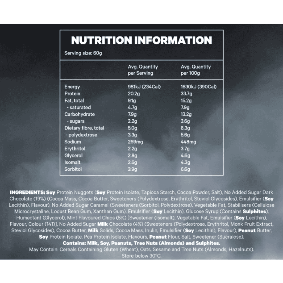 Soy Protein Nuggets (Soy Protein Isolate, Tapioca Starch, Cocoa Powder, Salt), No Added Sugar Dark Chocolate (19%) (Cocoa Mass, Cocoa Butter, Sweeteners (Polydextrose, Erythritol, Steviol Glycosides), Emulsifier (Soy Lecithin), Flavour), No Added Sugar Caramel (Sweeteners (Sorbitol, Polydextrose), Vegetable Fat, Stabilisers (Cellulose Microcrystaline, Locust Bean Gum, Xanthan Gum), Emulsifier (Soy Lecithin), Glucose Syrup (Contains Sulphites), Humectant (Glycerol), Mint Flavoured Chips (5%) [Sweetener (Isomalt), Vegetable Fat, Emulsifier (Soy Lecithin), Flavour, Colour (141)], No Added Sugar Milk Chocolate (4%) (Sweeteners (Polydextrose, Erythritol, Monk Fruit Extract, Steviol Glycosides), Cocoa Butter, Milk Solids, Cocoa Mass, Inulin, Emulsifier (Soy Lecithin), Flavour), Peanut Butter, Soy Protein Isolate, Pea Protein Isolate, Flavours, Peanut Flour, Salt, Sweetener (Sucralose). Contains: Milk, Soy, Peanuts, Tree Nuts (Almonds) and Sulphites. May Contain: Cereals Containing Gluten (Wheat), Oats, Sesame and Tree Nuts (Almonds, Hazelnuts).