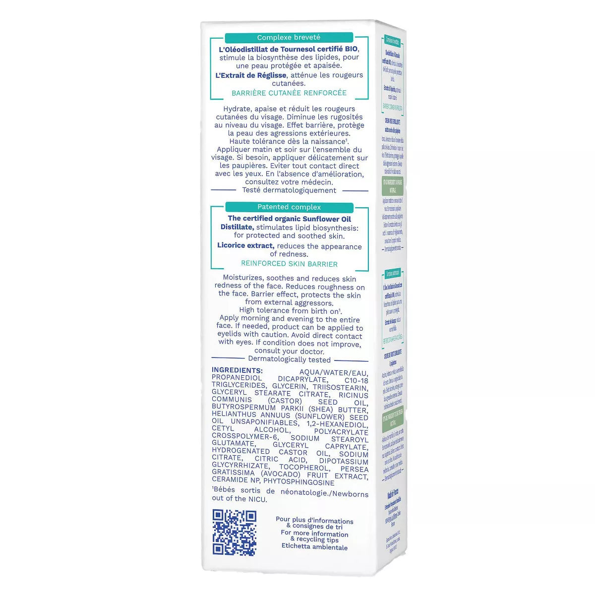 This emollient face cream is designed for extremely dry skin, providing hydration and soothing discomfort. Formulated with 97% natural ingredients, it includes sunflower oil distillate and licorice extract to reinforce the skin's moisture barrier. Suitable for babies and children, it is fragrance-free and dermatologically tested.