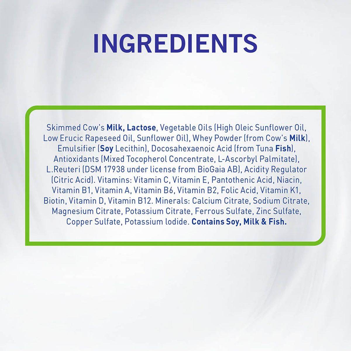 Skimmed Cow's Milk, Lactose, Vegetable Oils (High Oleic Sunflower Oil, Low Erucic Rapeseed Oil, Sunflower Oil), Whey Powder (from Cow's Milk), Emulsifier (Soy Lecithin), Docosahexaenoic Acid (from Tuna Fish), Antioxidants (Mixed Tocopherol Concentrate, L-Ascorbyl Palmitate), L. Reuteri (DSM 17938 under license from BioGaia AB), Acidity Regulator (Citric Acid). Vitamins: Vitamin C, Vitamin E, Pantothenic Acid, Niacin, Vitamin B1, Vitamin A, Vitamin B6, Vitamin B2, Folic Acid, Vitamin K1, Biotin, Vitamin D, Vitamin B12. Minerals: Calcium Citrate, Sodium Citrate, Magnesium Citrate, Potassium Citrate, Ferrous Sulfate, Zinc Sulfate, Copper Sulfate, Potassium Iodide. Contains Soy, Milk & Fish.