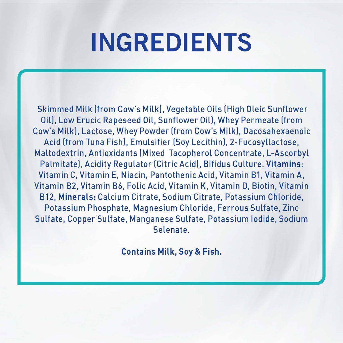 Skimmed Milk (from Cow's Milk), Vegetable Oils (High Oleic Sunflower Oil, Low Erucic Rapeseed Oil, Sunflower Oil), Whey Permeate (from Cow's Milk), Lactose, Whey Powder (from Cow's Milk), Dacosahexaenoic Acid (from Tuna Fish), Emulsifier (Soy Lecithin), 2-Fucosyllactose, Maltodextrin, Antioxidants (Mixed Tocopherol Concentrate, L-Ascorbyl Palmitate), Acidity Regulator (Citric Acid), Bifidus Culture, Vitamins: Vitamin C, Vitamin E, Niacin, Pantothenic Acid, Vitamin B1, Vitamin A, Vitamin B2, Vitamin B6, Folic Acid, Vitamin K, Vitamin D, Biotin, Vitamin B12, Minerals: Calcium Citrate, Sodium Citrate, Potassium Chloride, Potassium Phosphate, Magnesium Chloride, Ferrous Sulfate, Zinc Sulfate, Copper Sulfate, Manganese Sulfate, Potassium Iodide, Sodium Selenate. Contains Milk, Soy & Fish.