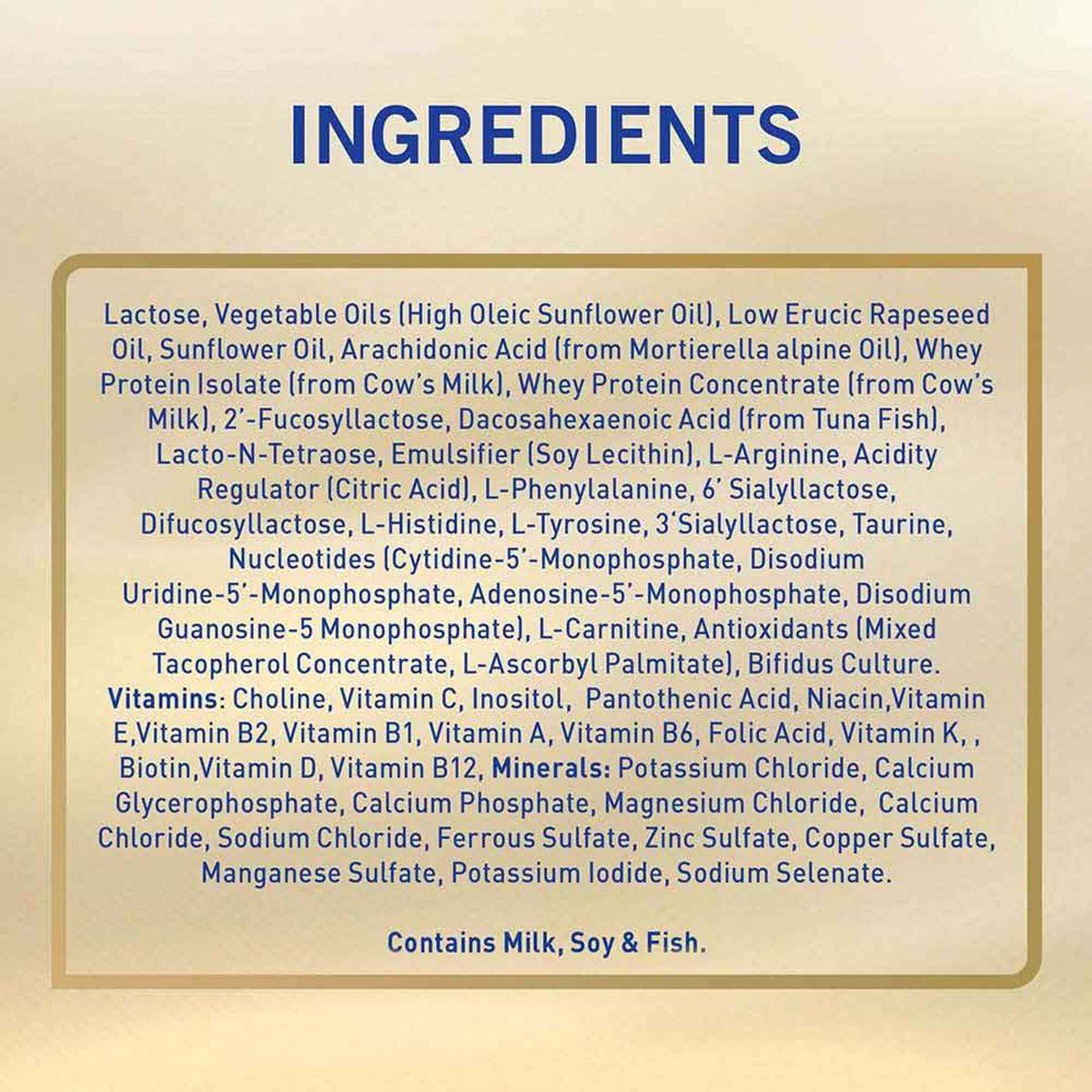 Lactose, Vegetable Oils (High Oleic Sunflower Oil, Low Erucic Rapeseed Oil, Sunflower Oil, Arachidonic Acid from Mortierella alpine Oil), Whey Protein Isolate (from Cow's Milk), Whey Protein Concentrate (from Cow's Milk), 2-Fucosyllactose, Docosahexaenoic Acid (from Tuna Fish), Lacto-N-Tetraose, Emulsifier (Soy Lecithin), L-Arginine, Acidity Regulator (Citric Acid), L-Phenylalanine, 6-Sialyllactose, Difucosyllactose, L-Histidine, L-Tyrosine, 3'-Sialyllactose, Taurine, Nucleotides (Cytidine-5-Monophosphate, Disodium Uridine-5-Monophosphate, Adenosine-5-Monophosphate, Disodium Guanosine-5'-Monophosphate), L-Carnitine, Antioxidants (Mixed Tocopherol Concentrate, L-Ascorbyl Palmitate), Bifidus Culture, Vitamins: Choline, Vitamin C, Inositol, Pantothenic Acid, Niacin, Minerals: Potassium Chloride, Calcium Glycerophosphate, Calcium Phosphate, Magnesium Chloride, Calcium Chloride, Sodium Chloride, Ferrous Sulfate, Zinc Sulfate, Copper Sulfate, Manganese Sulfate, Potassium Iodide, Sodium Selenate. Contains Milk, Soy & Fish.