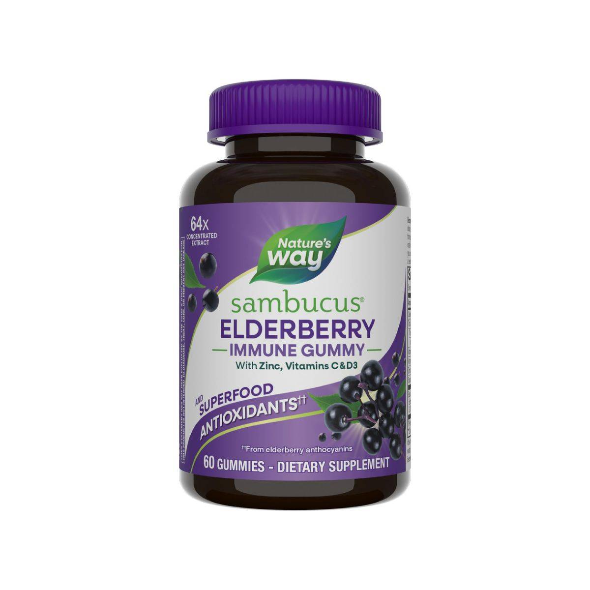 Nature's Way Sambucus Elderberry Gummies are designed for immune support. Each serving contains high-potency vitamin C, vitamin D3, and zinc, along with premium black elderberry extract. These gluten-free, vegetarian gummies are made with plant-based pectin and are free from gelatin, wheat, dairy, egg, peanut, and artificial colors.