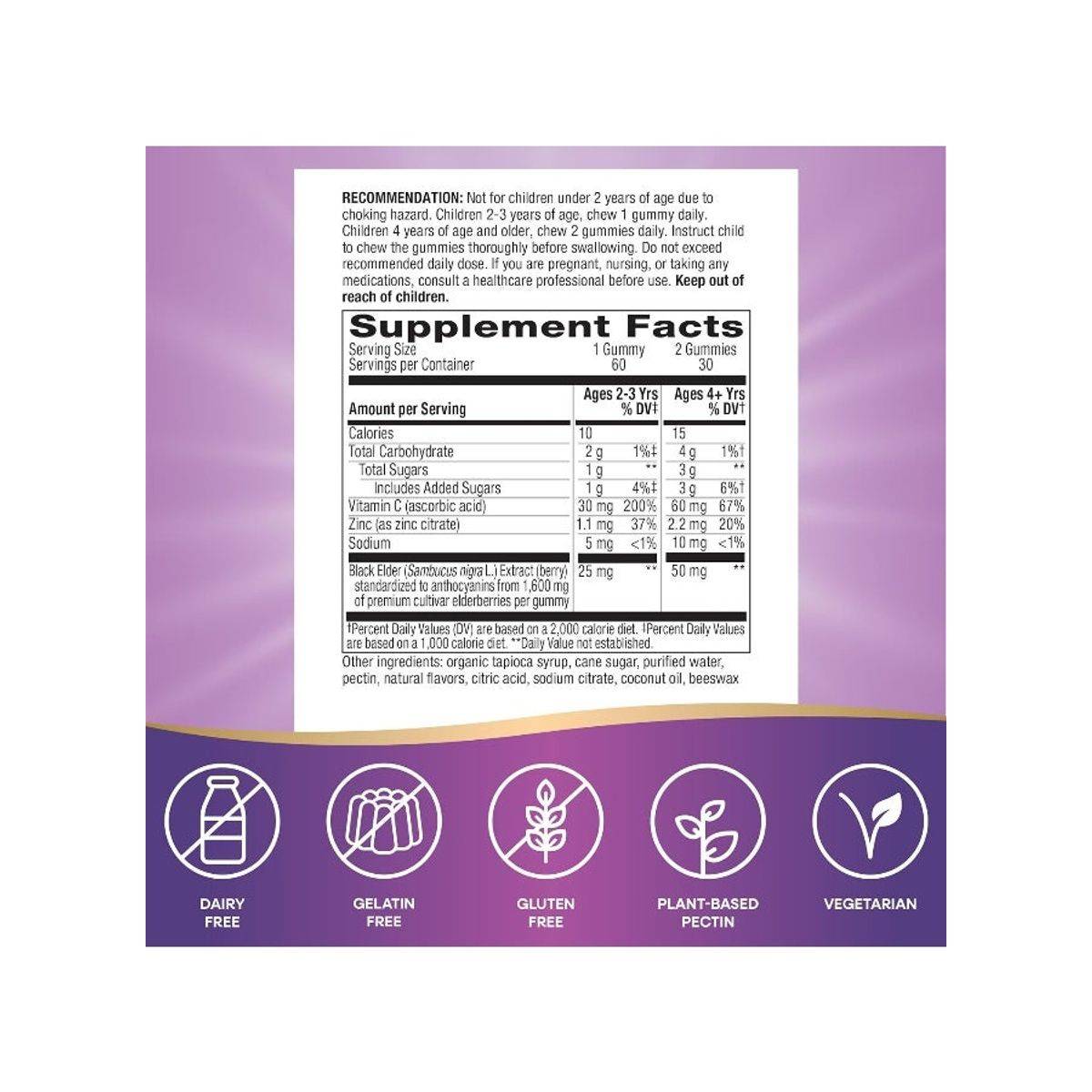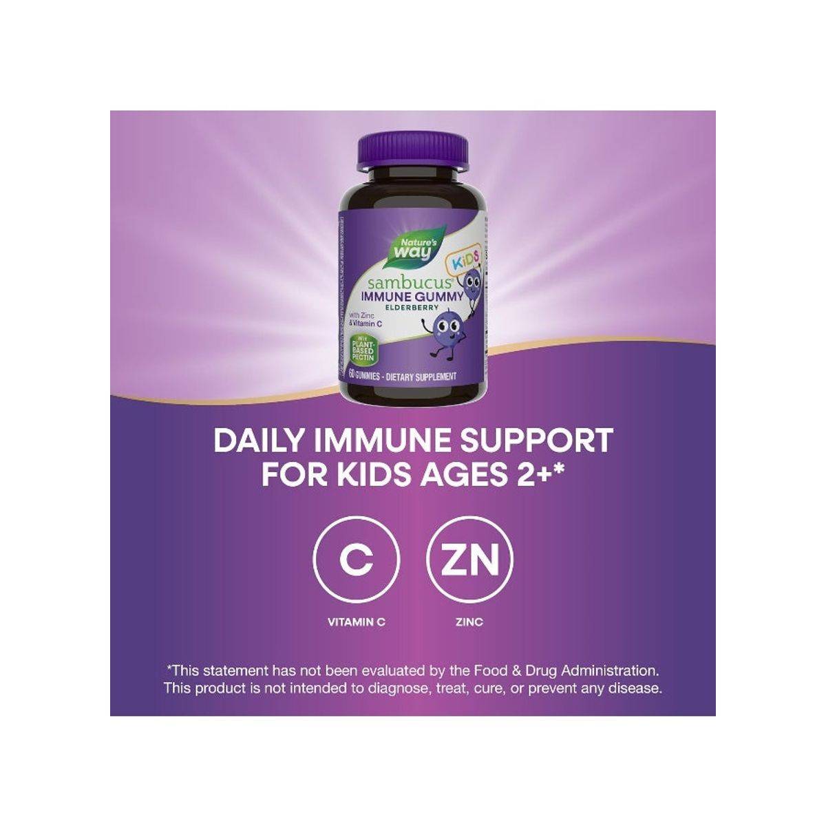 Natures Way Sambucus Kids Gummies provide immune support with elderberry, vitamin C, and zinc. Ideal for children ages 2+, these berry-flavored gummies are made with plant-based pectin.