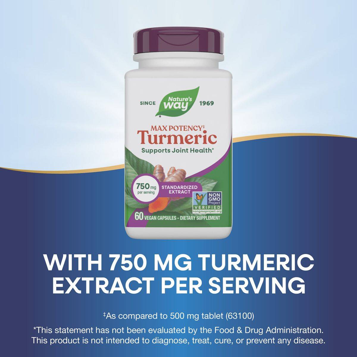Nature's Way Turmeric Max Potency is a dietary supplement standardized to 95% curcuminoids, supporting joint health. Each serving contains 750mg of turmeric extract, verified Non-GMO, vegan, and gluten-free. Ideal for adults seeking natural joint support.