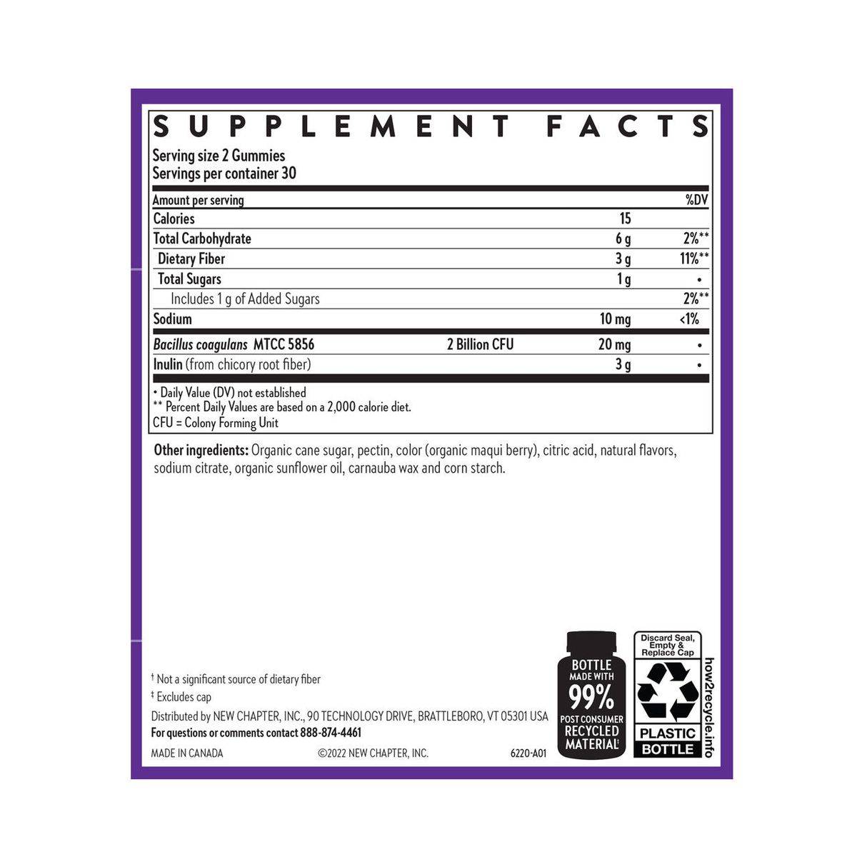 Bacillus coagulans MTCC 5856 2 Billion CFU, Inulin (from chicory root fiber) 3 g, Organic cane sugar, pectin, color (organic maqui berry), citric acid, natural flavors, sodium citrate, organic sunflower oil, carnauba wax, corn starch.