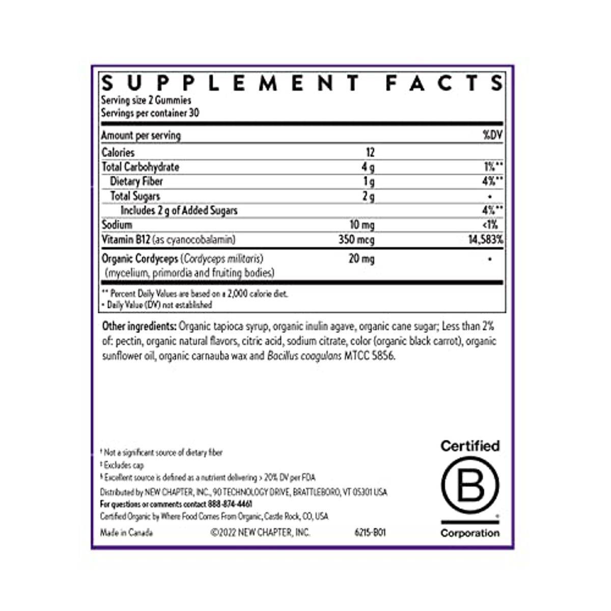 New Chapter Cellular Energy Vitamin B12+ Gummies are crafted to help your body convert food into fuel for cellular energy. Enhanced with organic Cordyceps mushroom, these gummies provide an excellent source of B12, delivering 14,583% Daily Value per serving. Made with organic Blue Agave Fiber, they contain 47% less sugar than most gummies and are 100% vegan and gluten-free.