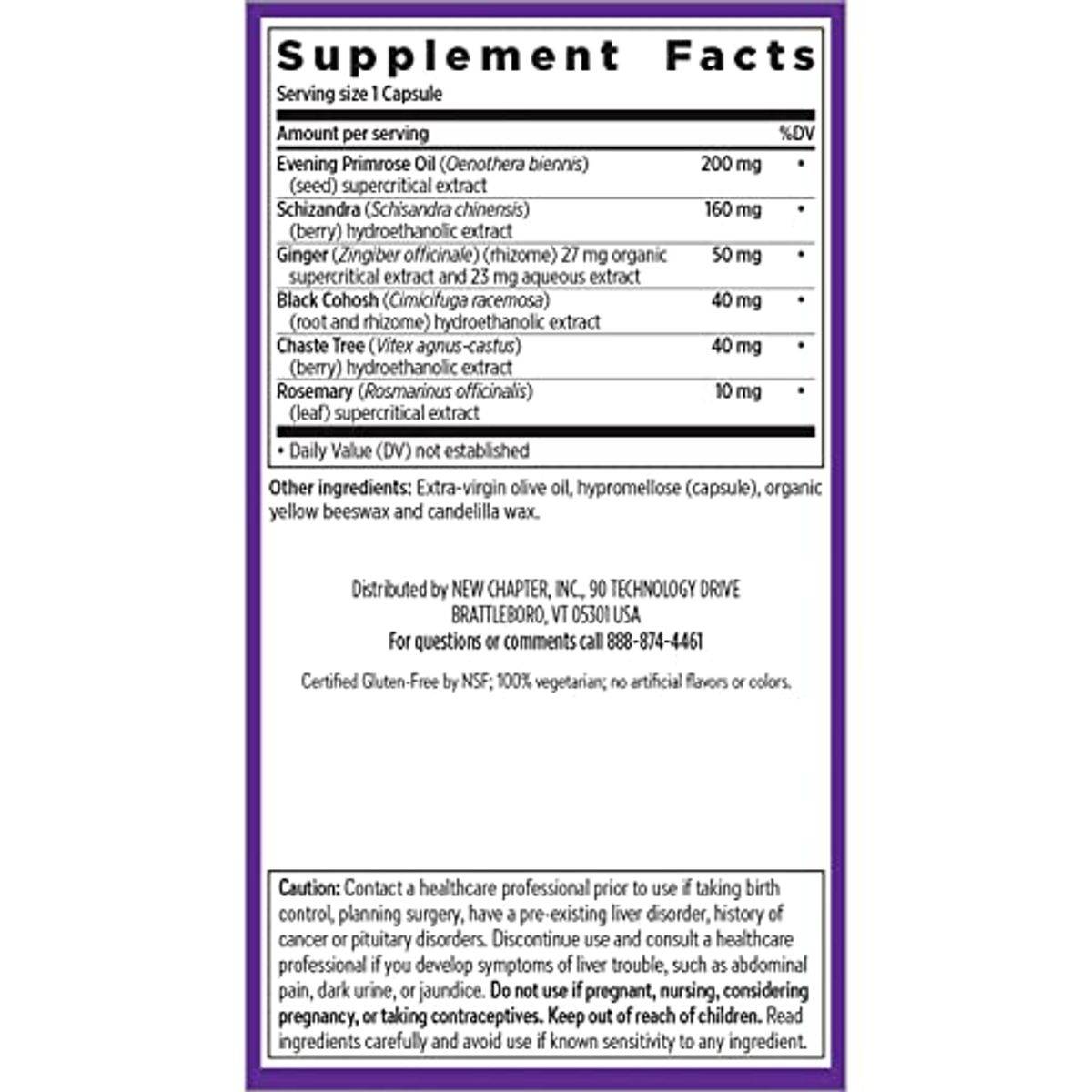 Evening Primrose Oil (Oenothera biennis) (seed) supercritical extract, Schizandra (Schisandra chinensis) (berry) hydroethanolic extract, Ginger (Zingiber officinale) (rhizome) 27 mg organic supercritical extract and 23 mg hydroethanolic extract, Black Cohosh (Cimicifuga racemosa) (root and rhizome) hydroethanolic extract, Chaste Tree (Vitex agnus-castus) (berry) hydroethanolic extract, Rosemary (Rosmarinus officinalis) (leaf) supercritical extract, Extra-virgin olive oil, Hypromellose (capsule), Organic yellow beeswax, Candelilla wax.