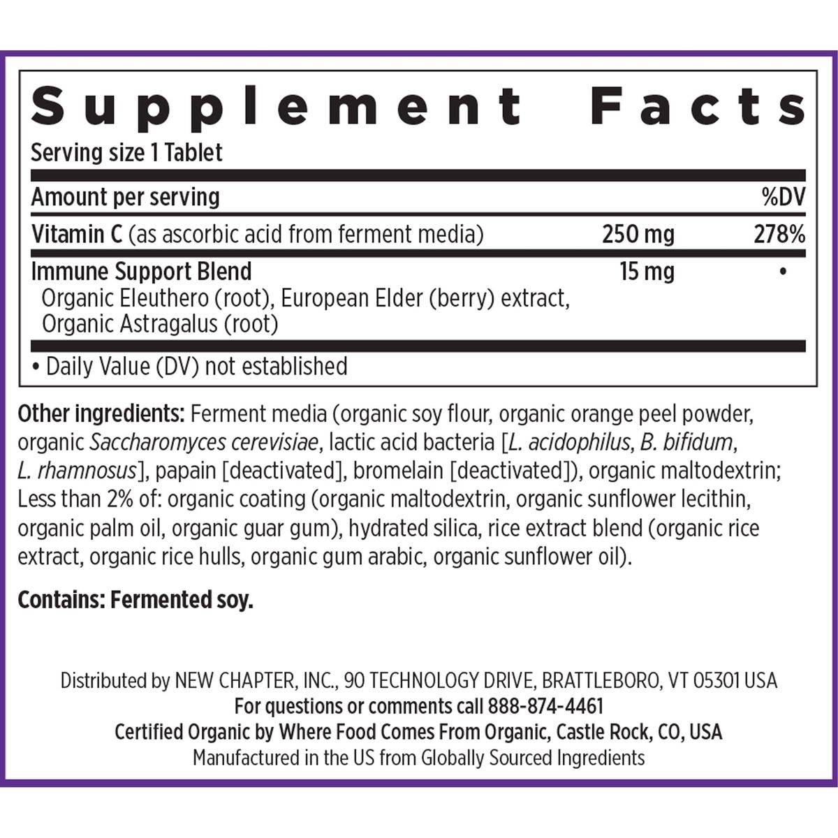 Vitamin C (as ascorbic acid from ferment media), Organic Eleuthero (root), European Elder (berry) extract, Organic Astragalus (root), Ferment media (organic soy flour, organic orange peel powder, organic Saccharomyces cerevisiae, lactic acid bacteria [L. acidophilus, B. bifidum, L. rhamnosus], papain [deactivated], bromelain [deactivated]), organic maltodextrin; Less than 2% of: organic coating (organic maltodextrin, organic sunflower lecithin, organic palm oil, organic guar gum), hydrated silica, rice extract blend (organic rice extract, organic rice hulls, organic gum arabic, organic sunflower oil).