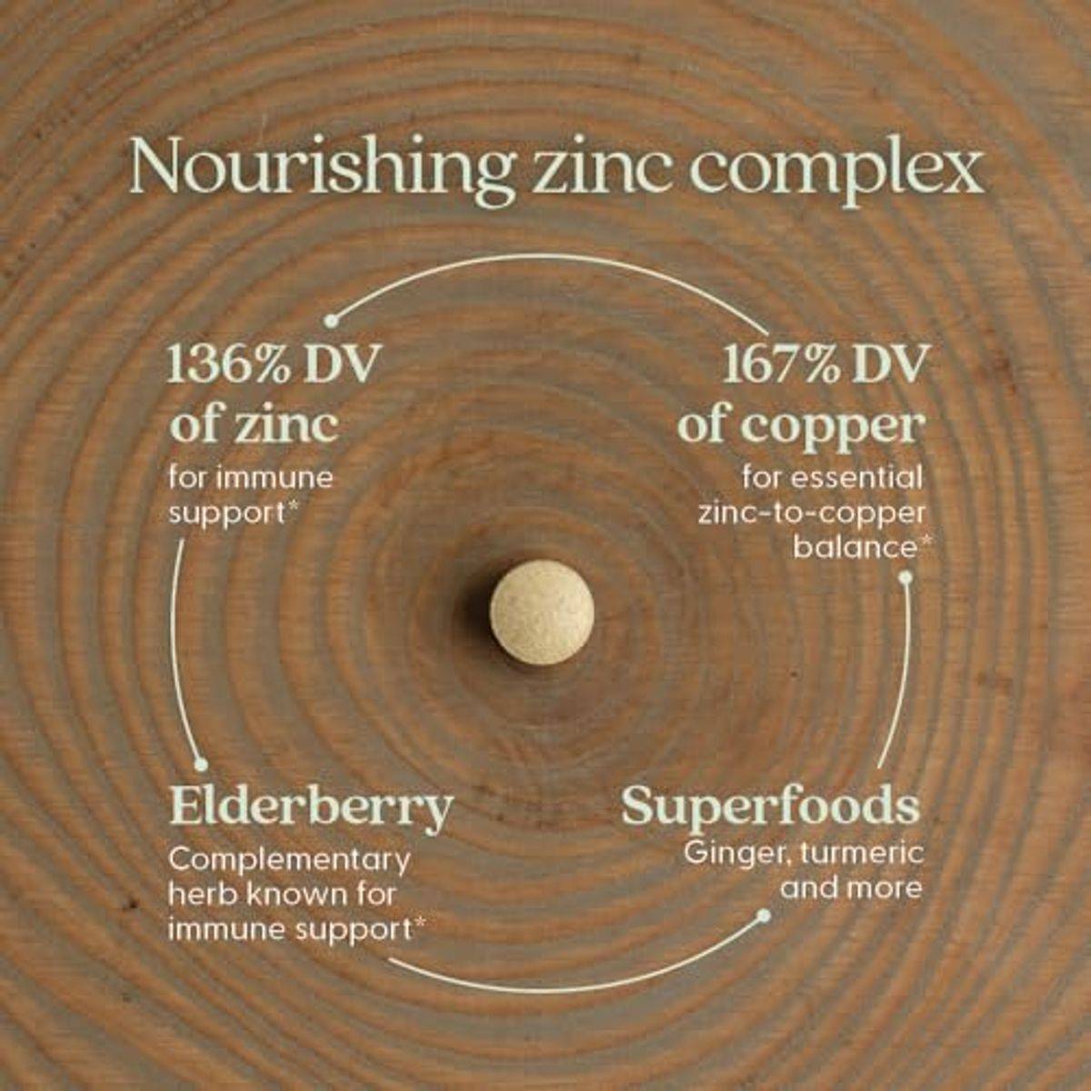 New Chapter Fermented Zinc Complex is a dietary supplement designed to support immune and skin health. Formulated with fermented zinc for better absorption, it includes a blend of organic herbs and nutrients. Each tablet provides 136% DV of zinc and 167% DV of copper, promoting mineral balance and overall vitality.