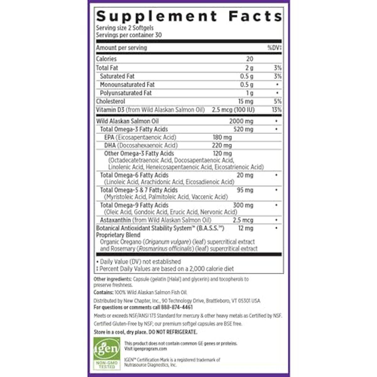 Wild Alaskan Salmon Oil, Vitamin D3, Astaxanthin, Organic Oregano Extract, Organic Rosemary Extract, Gelatin, Glycerin, Tocopherols.