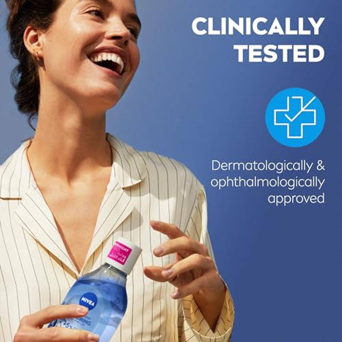 NIVEA Restoring Micellar Water is designed for tired and sensitive skin, enriched with 5% serum containing Panthenol & Squalane. It removes waterproof make-up, impurities, and dirt with featherlight swipes, restoring moisture for overnight regeneration. Clinically tested, dermatologically and ophthalmologically approved.