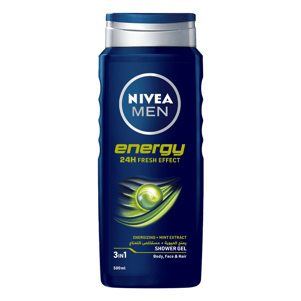 Nivea Men Shower Gel Energy 500ml invigorates with mint extract for a refreshing 24-hour effect. Ideal for body, face, and hair.