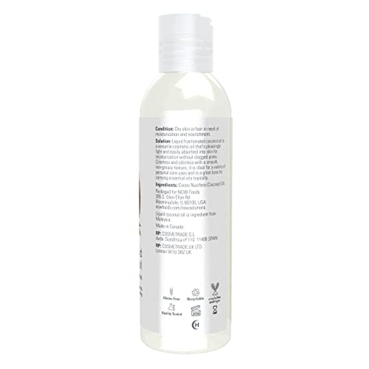 NOW Solutions Liquid Coconut Oil is a versatile cosmetic oil that provides comprehensive moisturization without clogging pores. It is light, easily absorbed, and suitable for dry skin or hair care, massage therapy, and as a carrier oil for essential oils. The product is colorless, odorless, and non-greasy, making it ideal for various personal care uses. It helps soften dry, damaged hair and adds a healthy shine.