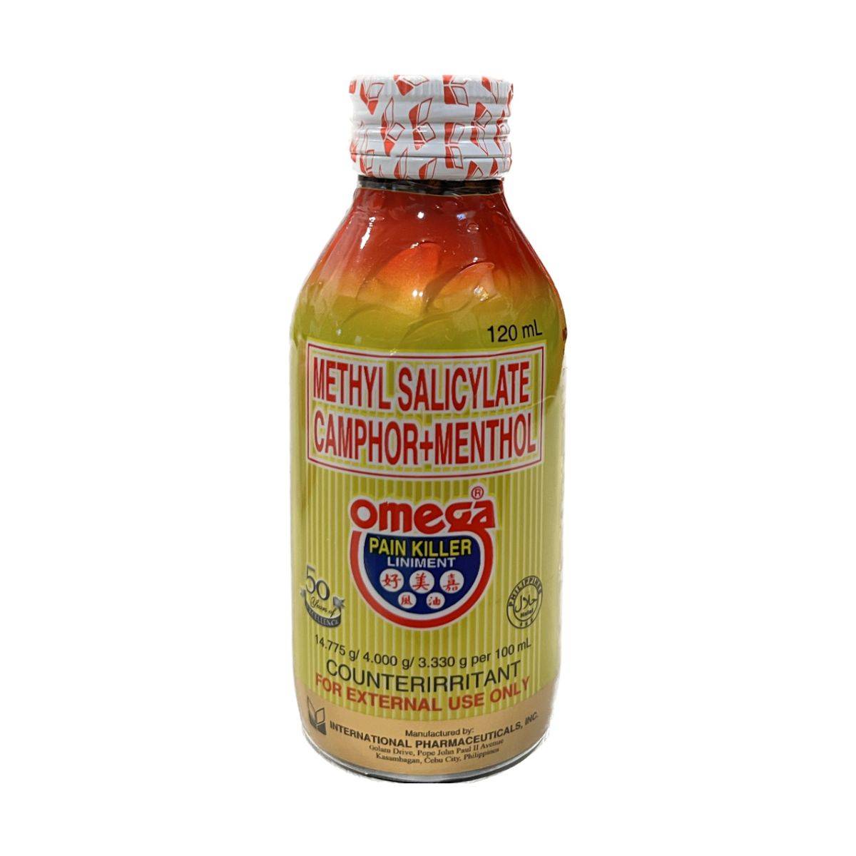 Omega Pain Killer Liniment is a topical analgesic designed for fast relief of joint and muscle pains. Formulated with methyl salicylate, camphor, and menthol, it provides effective relief for rheumatic ailments, sciatica, and more. Ideal for external use, it is manufactured by International Pharmaceuticals, Inc. in the Philippines.