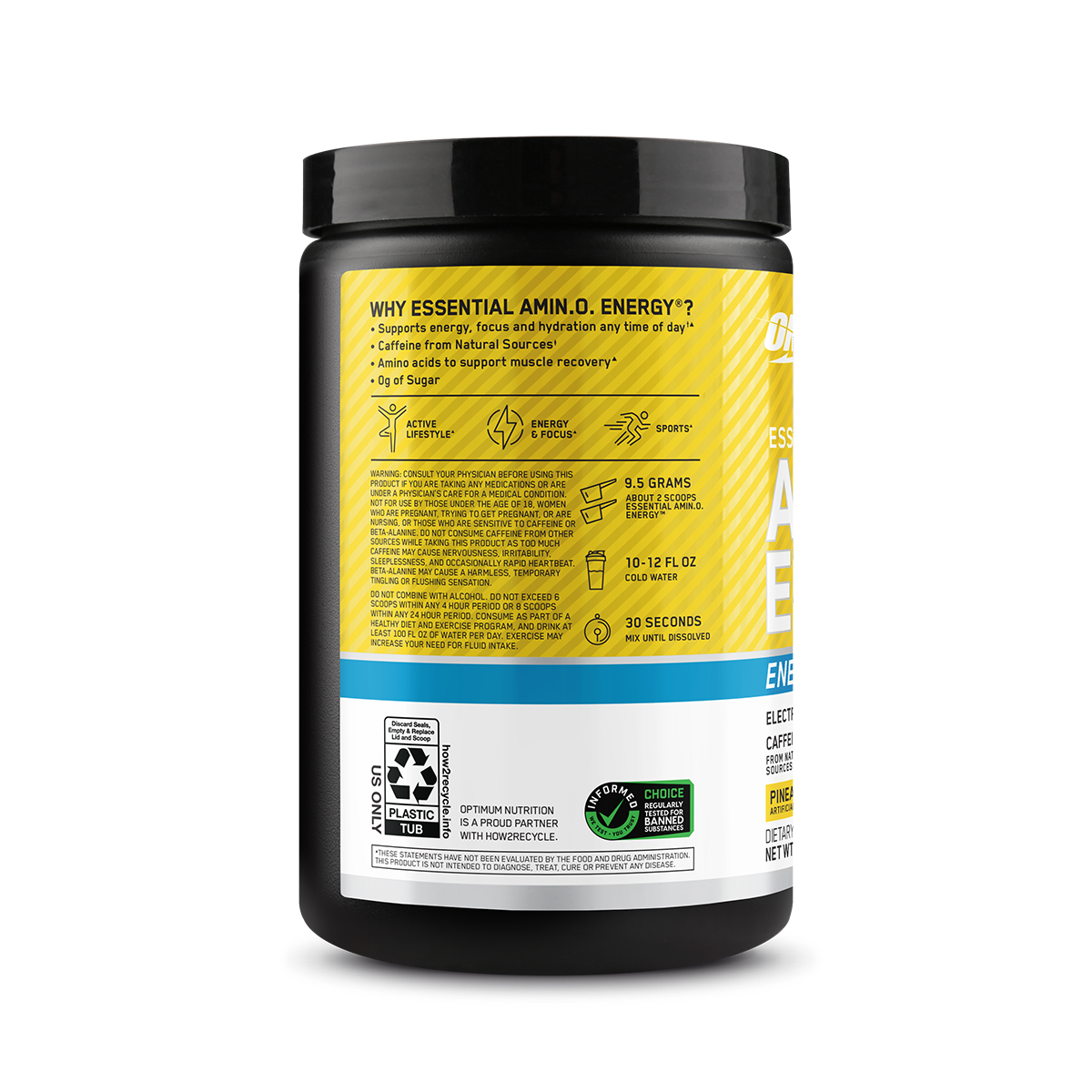 Start fast and finish strong in the gym or on the field. Essential Amino.O. Energy Plus Electrolytes Sparkling Hydration Drink offers a combination of 5 grams of Amino Acids to support muscle recovery, 100 mg of Caffeine from natural sources to support energy and focus, and electrolytes to support performance, endurance and active living.