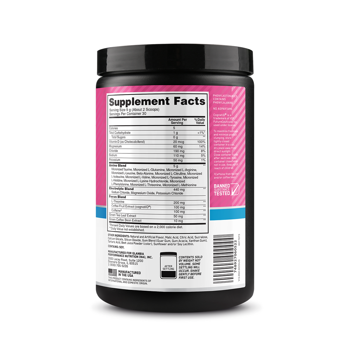Citric Acid, Natural and Artificial Flavors, Malic Acid, Silicon Dioxide, Calcium Silicate, Tartaric Acid, Caffeine (from Tea and/or Coffee Bean), Gum Blend (Cellulose Gum, Xanthan Gum, Carrageenan), Sucralose, Lecithin, FD&C Red #40, FD&C Blue #2.