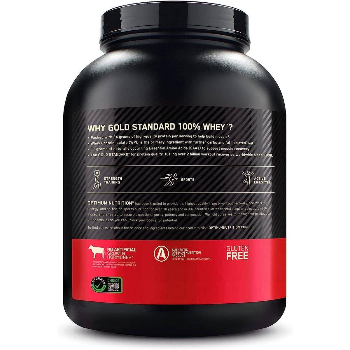 Optimum Nutrition Gold Standard 100% Whey Protein is designed for muscle support and recovery. Each serving provides 24 grams of protein, including whey protein isolate, concentrate, and peptides. The product is gluten-free and tested for banned substances, ensuring safety and quality. Ideal for athletes and fitness enthusiasts.