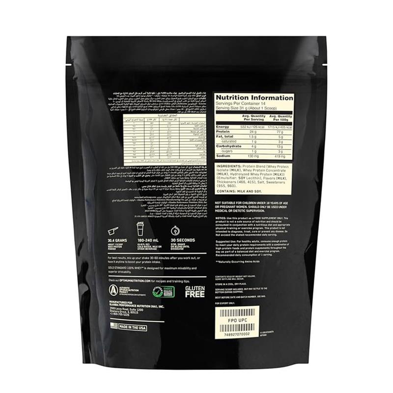 Whey Protein Isolates (WPI) are the purest form of whey protein that currently exists. WPIs are costly to use, but rate among the best proteins that money can buy. That's why they're the first ingredient you read on the Gold Standard 100% Whey™ label. By using WPI as the primary ingredient along with premium ultra-filtered whey protein concentrate (WPC), we're able to pack 24 grams of protein into every serving to support your muscle building needs after training. ON's attention to detail also extends to mixability. This superior quality powder has been instantized to mix easily using a shaker cup or just a glass and spoon. There's no doubt that this is the standard by which all other whey proteins are measured.