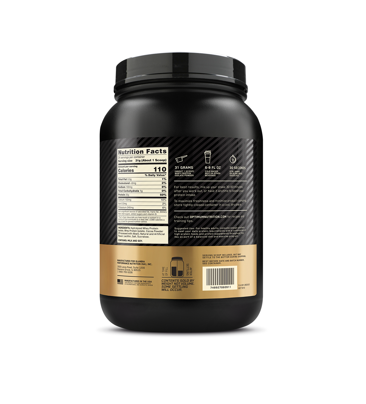 GOLD STANDARD 100% Isolate protein powder supports muscle and recovery3 with 25g of ultra-filtered whey protein and 5.5g of naturally occurring BCAAs per serving.