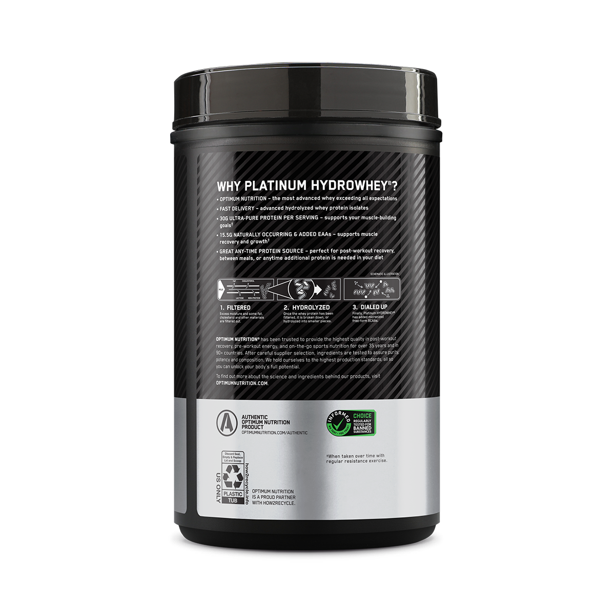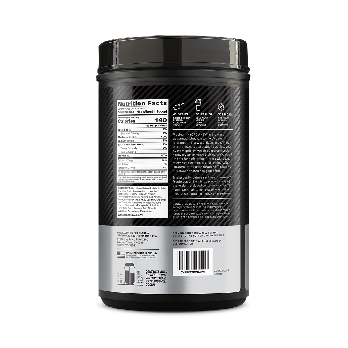 Platinum Hydrowhey® is the most advanced whey protein we've ever developed. In a word: Excellence. By hydrolyzing whey protein isolates to break larger proteins down into smaller pieces, these ultra-pure whey isolates are able to get into your system rapidly, enabling your muscles to start recovering from heavy training. We've dialed up this ultra pure and rapidly-digesting formula with added micronized Branched Chain Amino Acids (BCAAs).