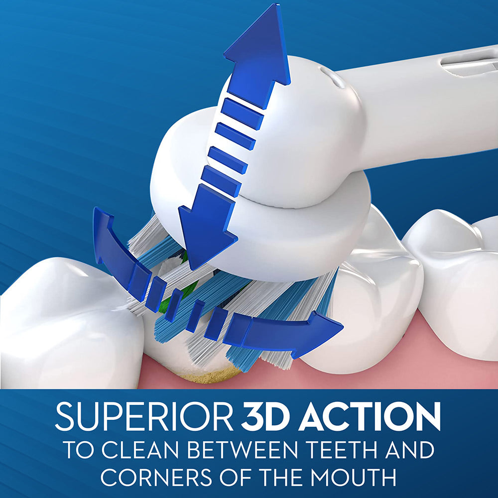 ROUND HEAD DESIGN Surrounds each tooth for superior cleaning. CLINICALLY PROVEN 3D CLEANING Oscillates and pulsates to remove up to 100% more plaque along the gumline vs. manual toothbrush. TIME COACHING Helps ensure you brush for the dentist-recommended 2 minutes. PRESSURE SENSOR Stops pulsations if you brush too hard to protect gums. BUILT-IN TIMER Alerts you to complete optimal brushing time.