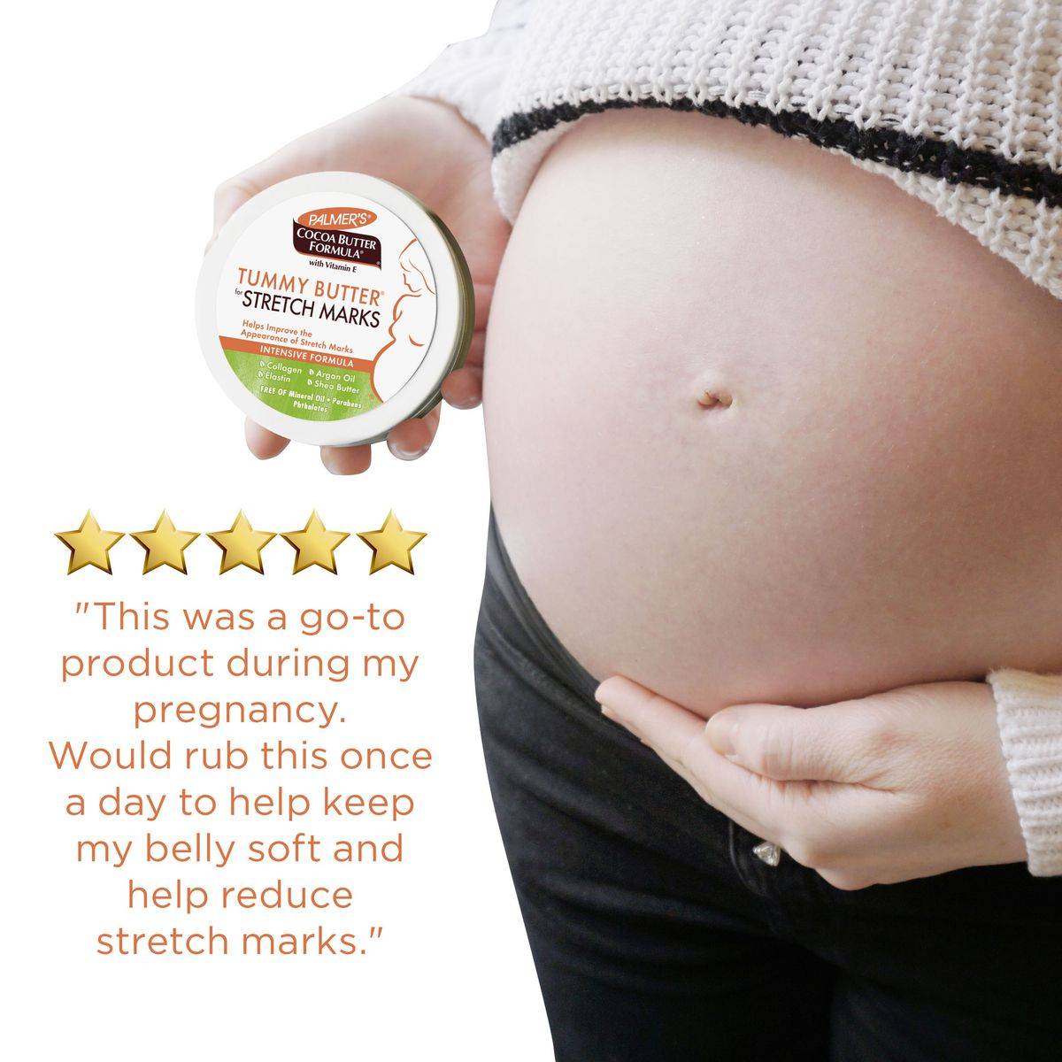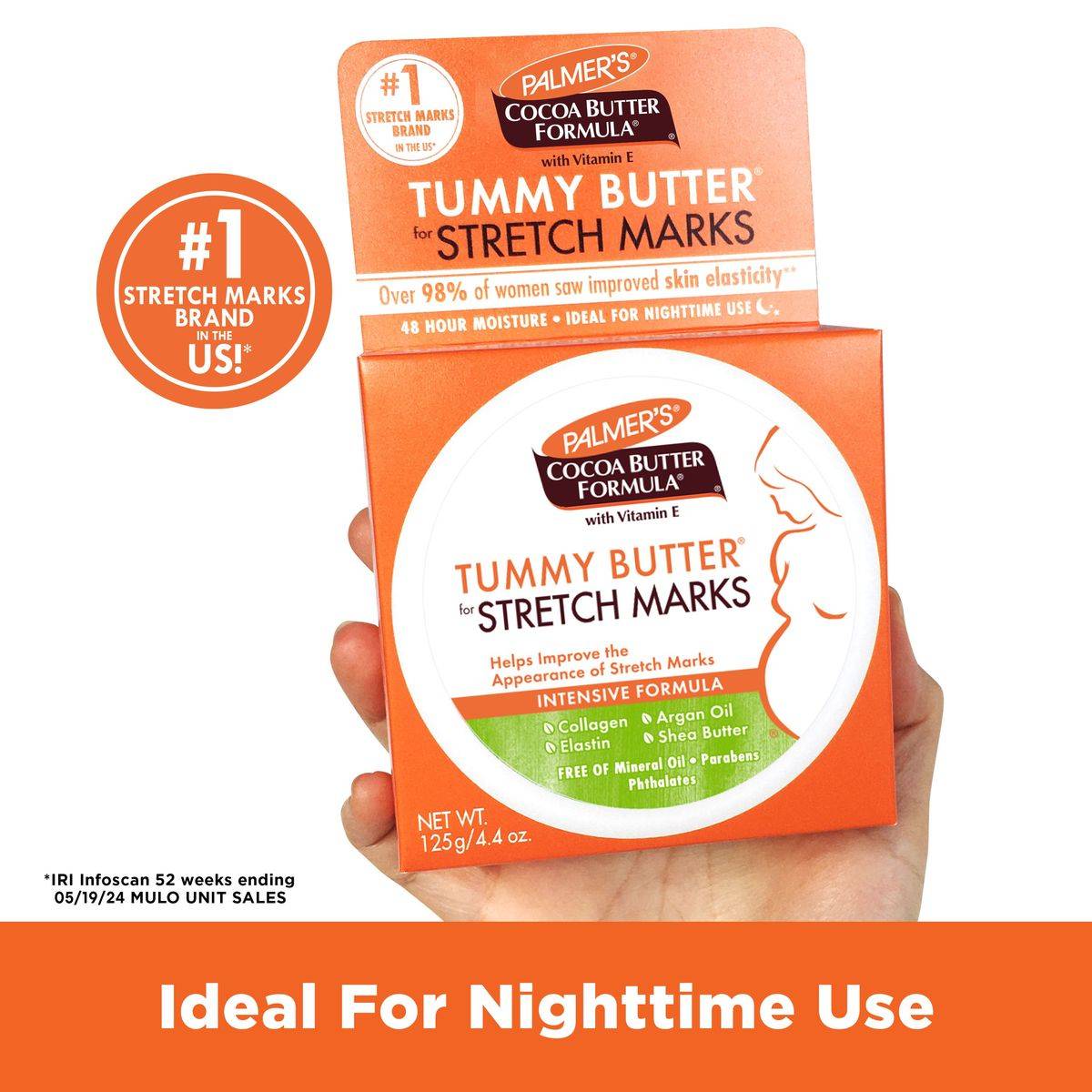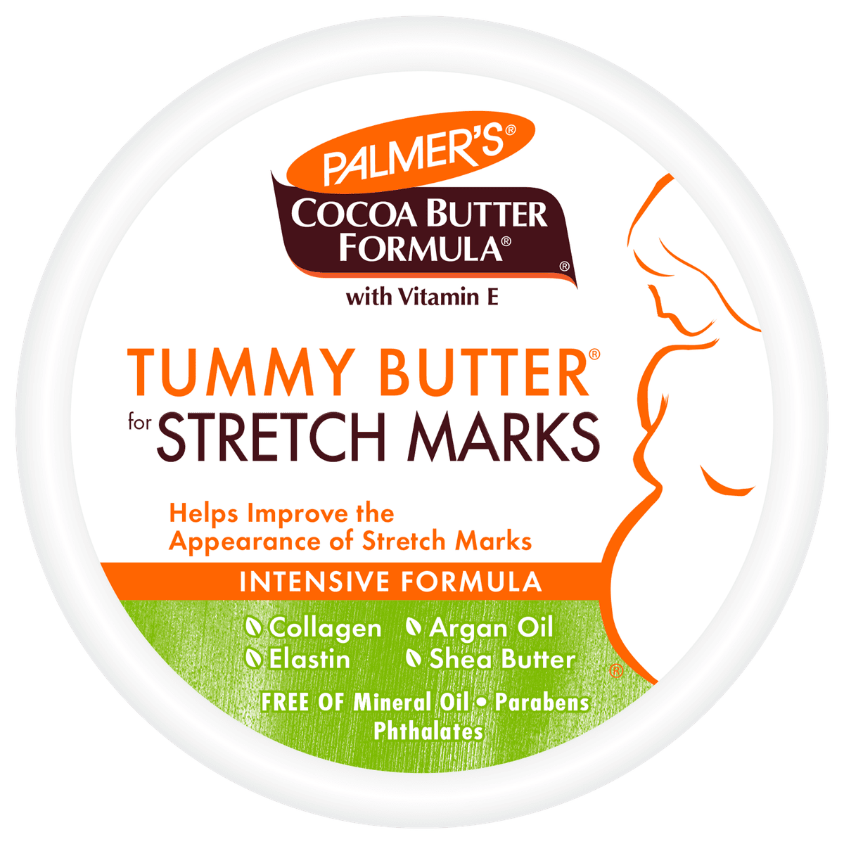 Palmer's Cocoa Butter Formula Tummy Butter is an intensive treatment for stretch marks, enriched with Cocoa Butter, Shea Butter, and Vitamin E. Ideal for nighttime use, it provides 48-hour moisture and helps improve skin elasticity.